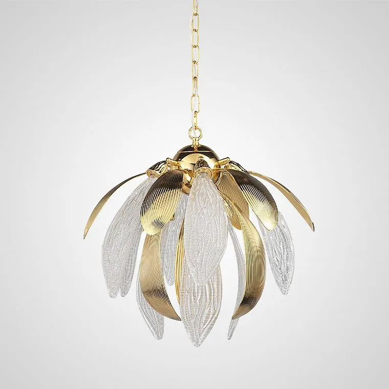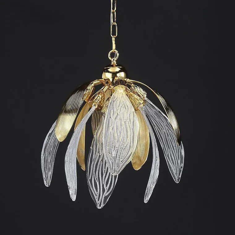 Золотой каркас грациозно обвивает детализированные стеклянные лепестки, на ниспадающих бутонах. Текстурированные золотые элементы гармонично дополняют хрустальную прозрачность, создавая удивительную игру света и тени. Эти люстры словно оживают под мягким освещением — они трепетно наполняют пространство атмосферой уюта и спокойствия.