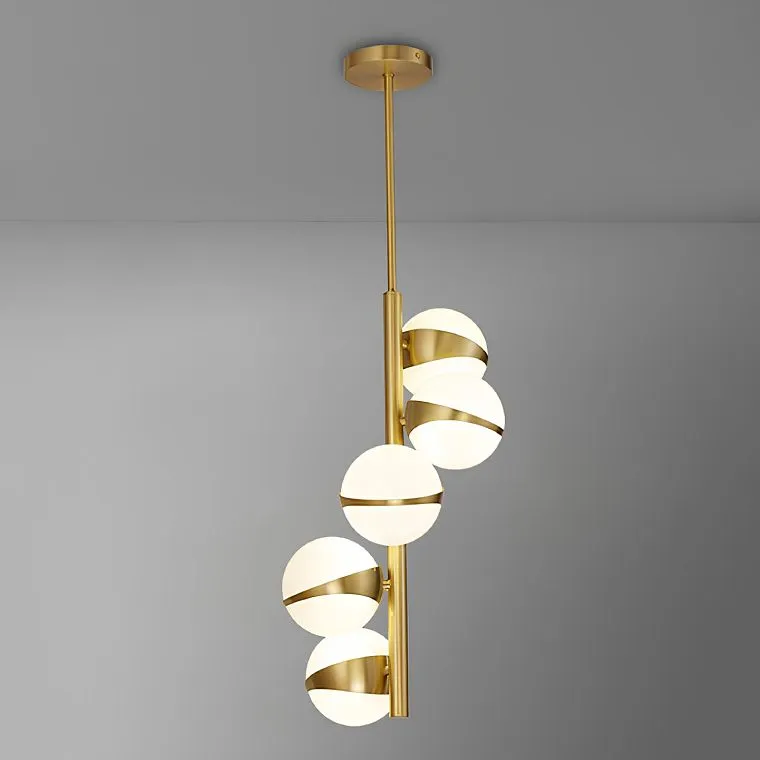 Или, рассмотрите вариант на 5 плафонов-шаров, словно спиральной галактикой опускающихся на усиленной стойке из латуни. Эти светильники будто вращаются в пространстве, создавая великолепный танец света и тени. Разместите его в зоне отдыха — и комната наполнится мягким, обволакивающим светом, которые делает вечерние часы по-настоящему волшебными.