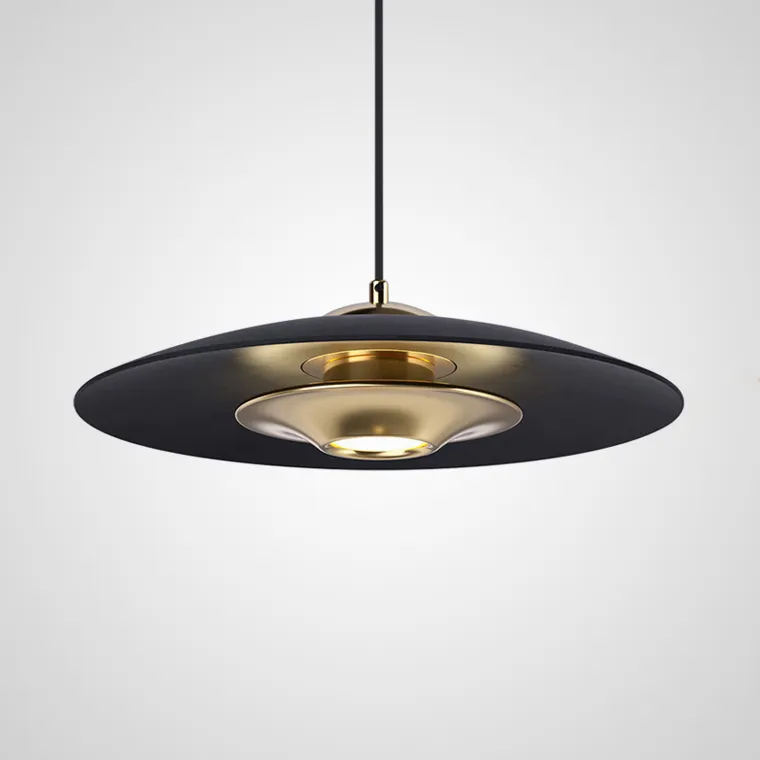 Подвесной светодиодный светильник с точечным источником в сборном корпусе из черных и латунных дисков