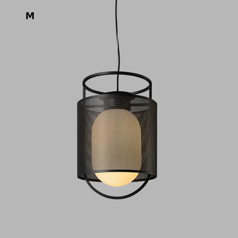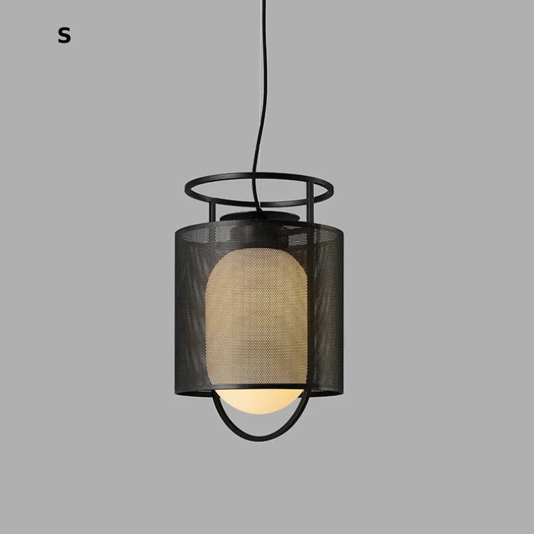 Серия подвесных светильников со стеклянными матовыми плафонами эллиптической формы внутри сетчатого абажура