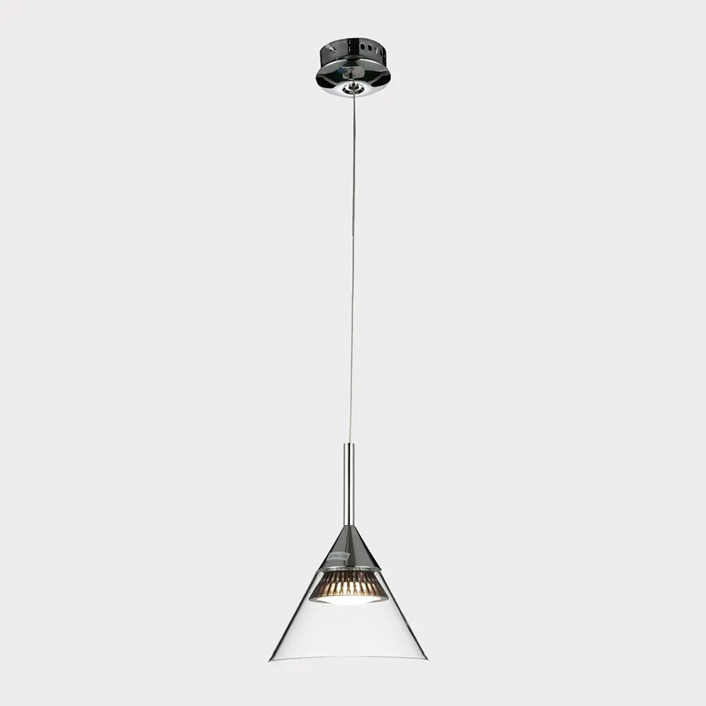 Прозрачный плафон-конус изготовлен из качественного стекла, а металлический каркас имеет хромовое покрытие. Благодаря своей простой и изящной форме, светильник прекрасно вписывается в любой интерьер и становится его гармоничным дополнением.