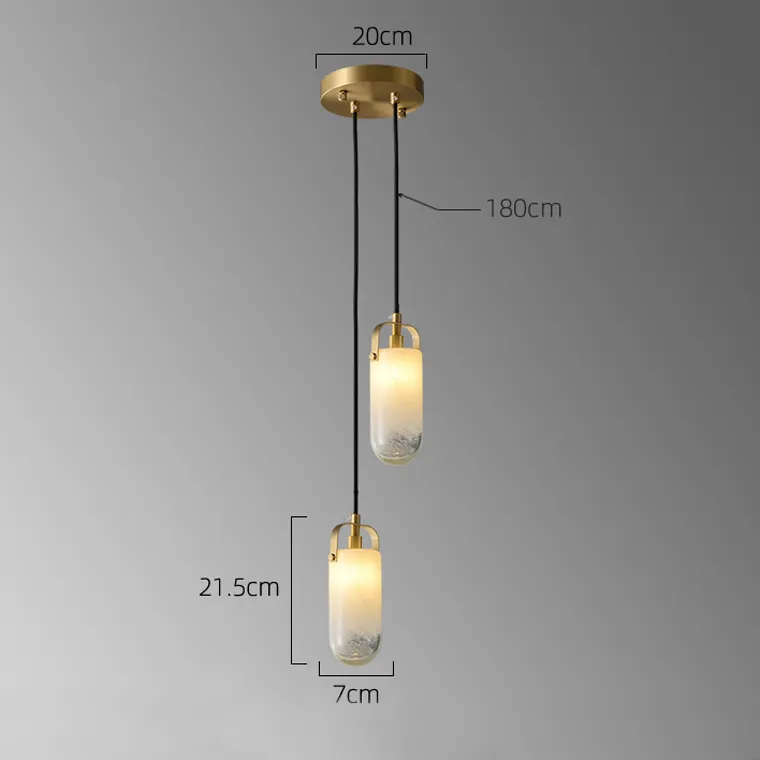 Крепление светильника имеет диаметр 20 см, а плафоны — размеры 7 x 21,5 см. Высота подвеса составляет 180 см, что позволяет разместить светильник даже в помещениях с высокими потолками.