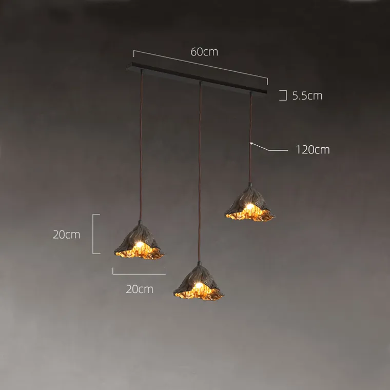 Готовая комбинация подвесных светильников с тремя плафонами в виде высушенных цветов с внутренней отделкой под золото