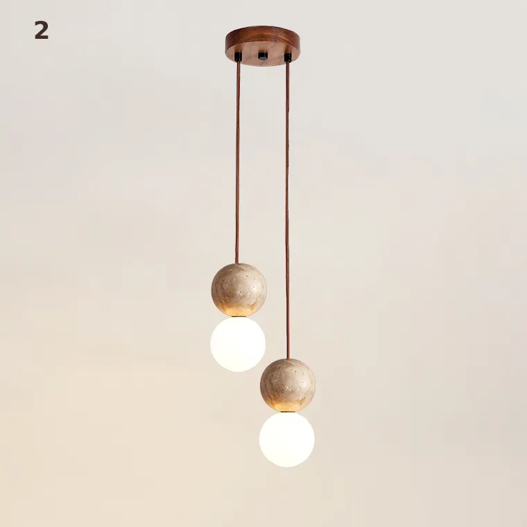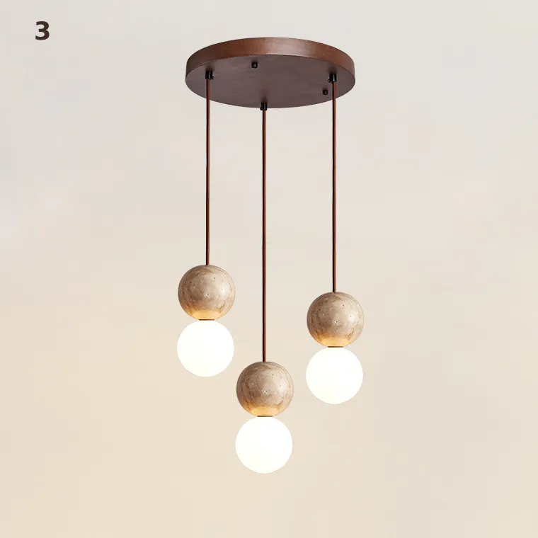 Готовая комбинация подвесных светильников с шарообразными стеклянными плафонами и каменными сферами