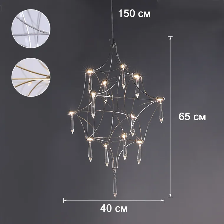 Подвесной светильник со светодиодными источниками света на ажурном металлическом каркасе с подвесками в виде хрустальных камней
