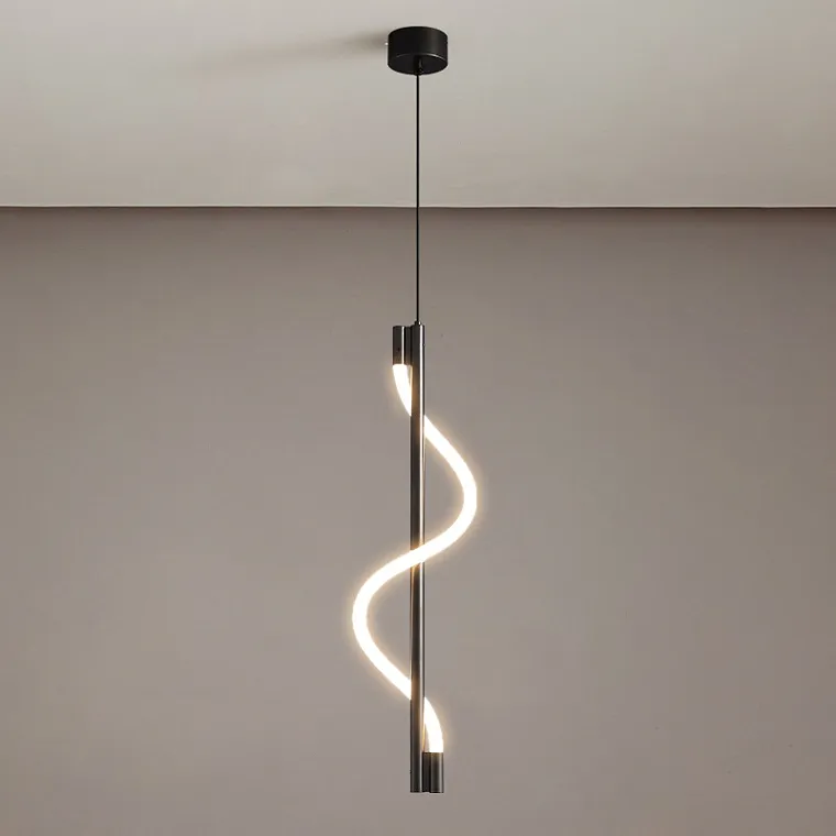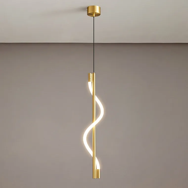 Подвесной светодиодный светильник в виде изогнутого светящегося шнура на цилиндрическом корпусе из латуни