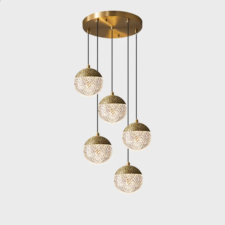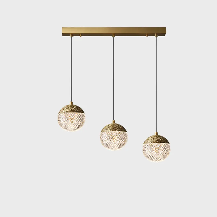 Готовая комбинация подвесных светодиодных светильников с шарообразными рельефными плафонами в латунном корпусе