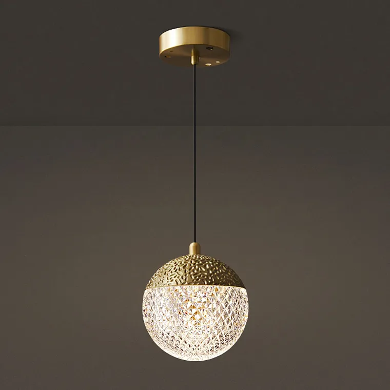 Подвесной светодиодный светильник с шарообразным рельефным плафоном в латунном корпусе с орнаментом