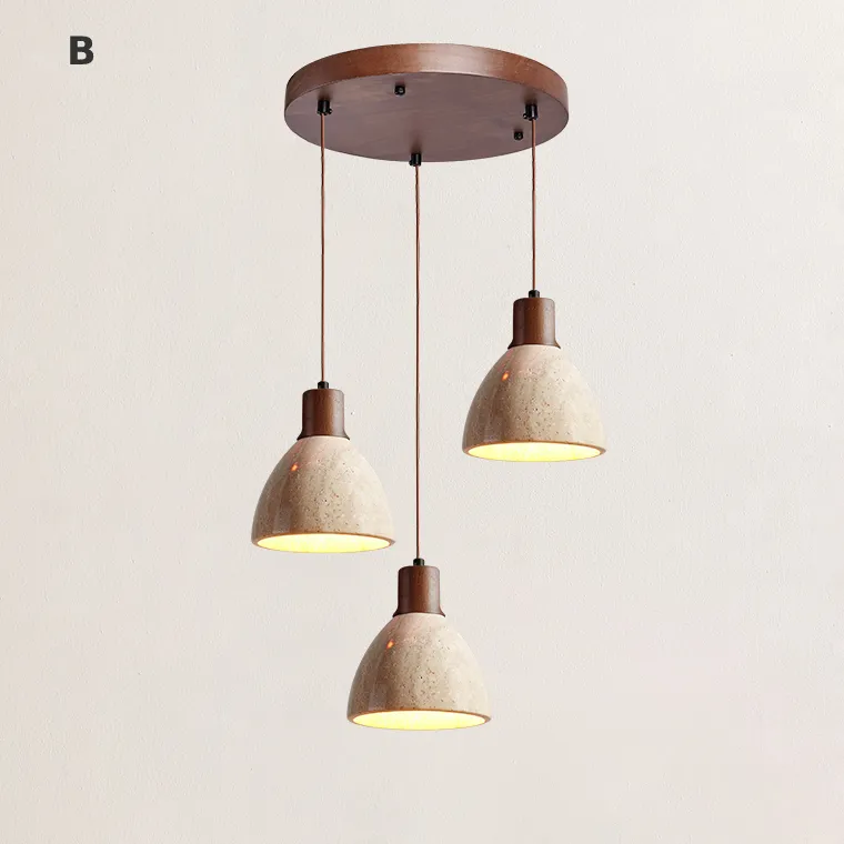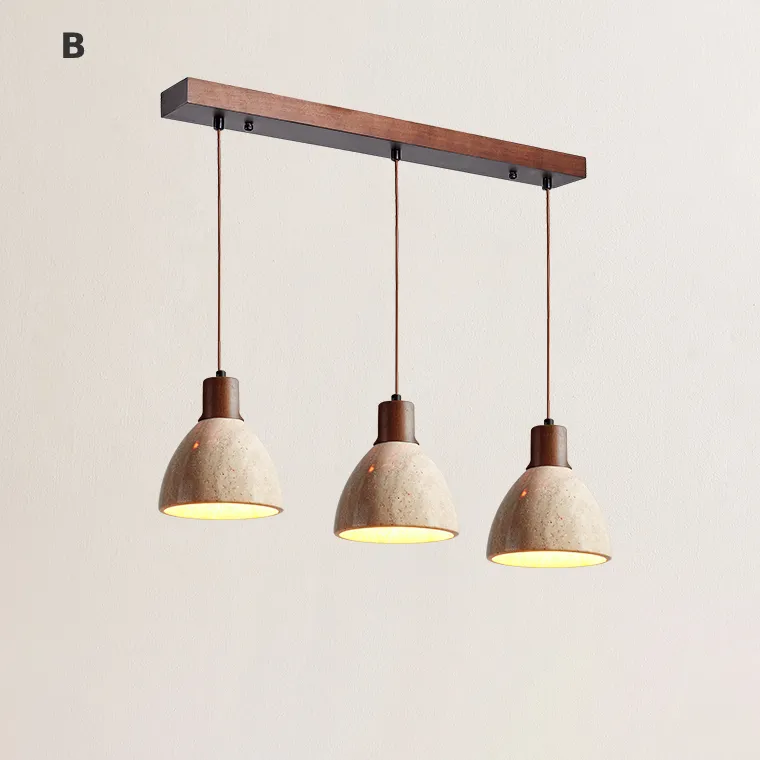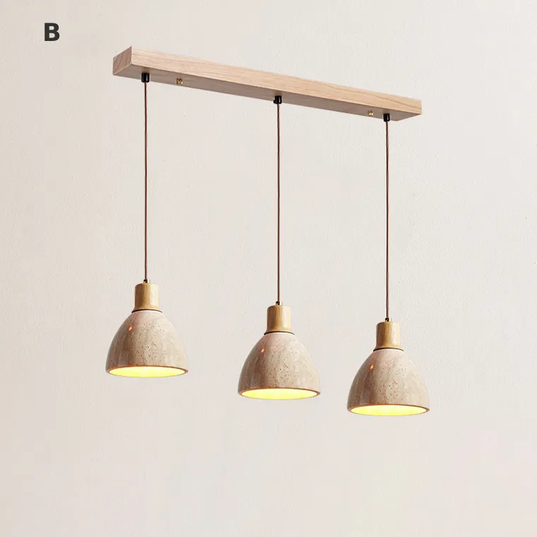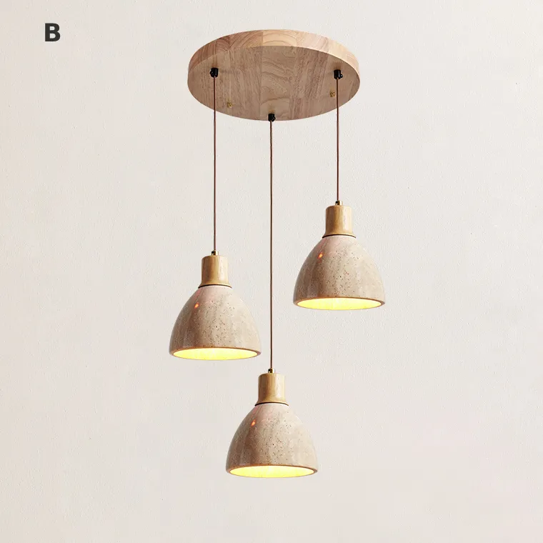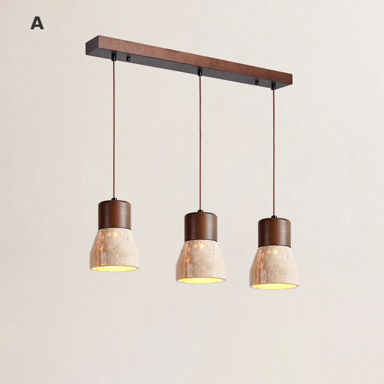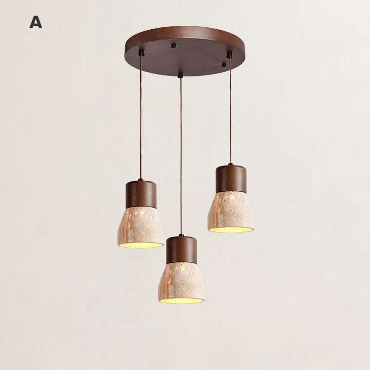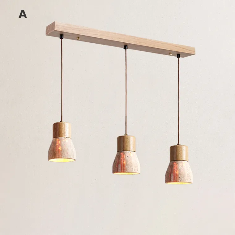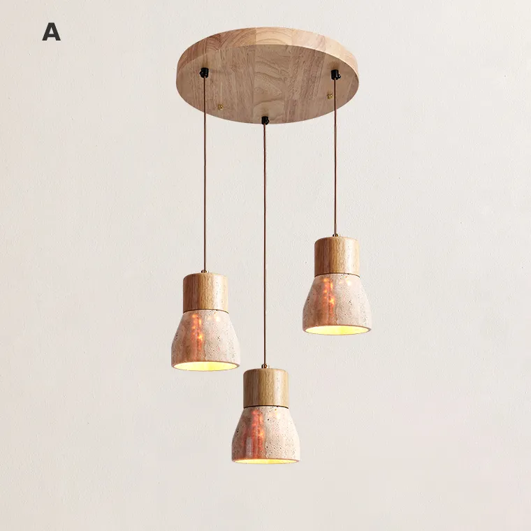 Готовая комбинация подвесных светильников с геометрическими плафонами из камня травертина с деревянной отделкой