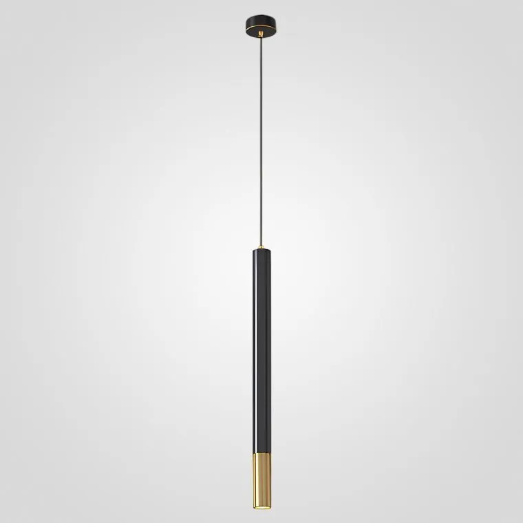 Подвесной светодиодный светильник вытянутой цилиндрической формы с окантовкой латунного оттенка.