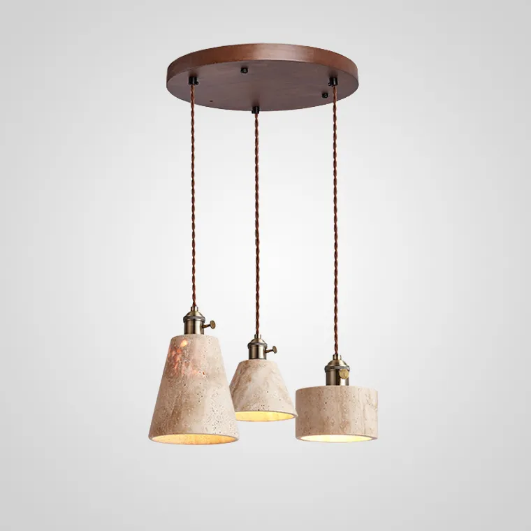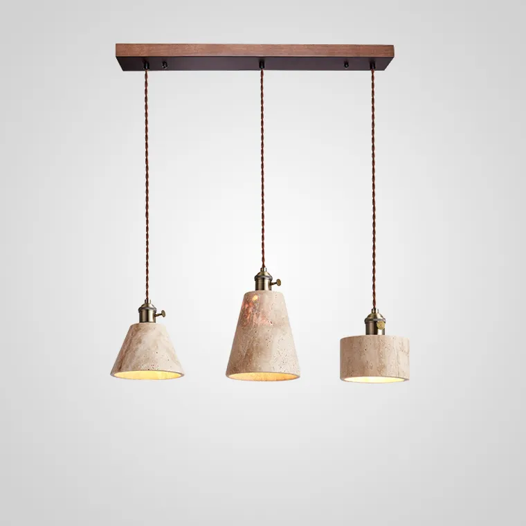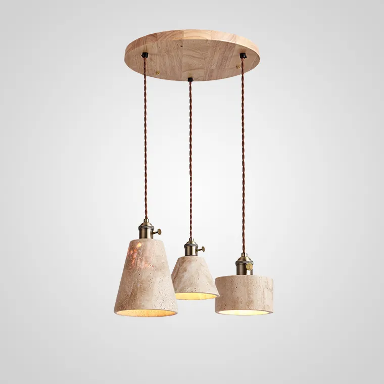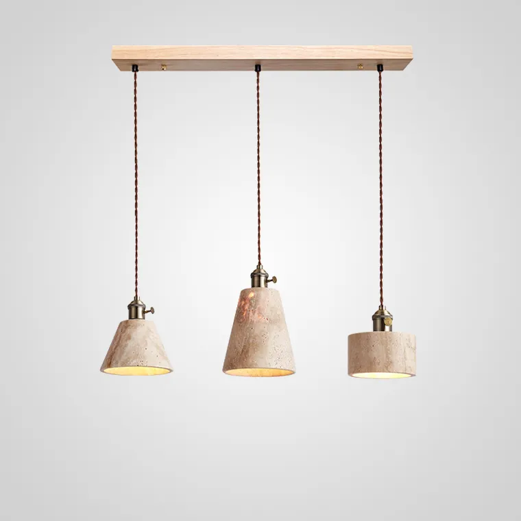 Готовая комбинация подвесных светильников с каменным корпусом геометрической формы и деревянным креплением