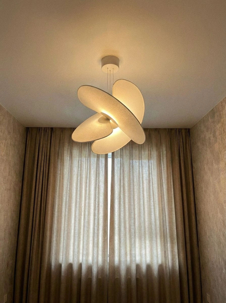 И не зря! Мы заказали её в гостиную – у нас высокие потолки, и светильник смотрится просто потрясающе! Он освежает пространство: плафоны светлые, свет мягкий и приятный. Диаметр около 60 см, а необычные лепестки напоминают футуристический цветок – асимметричный, немного космический, но очень стильный.