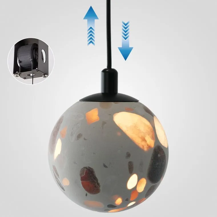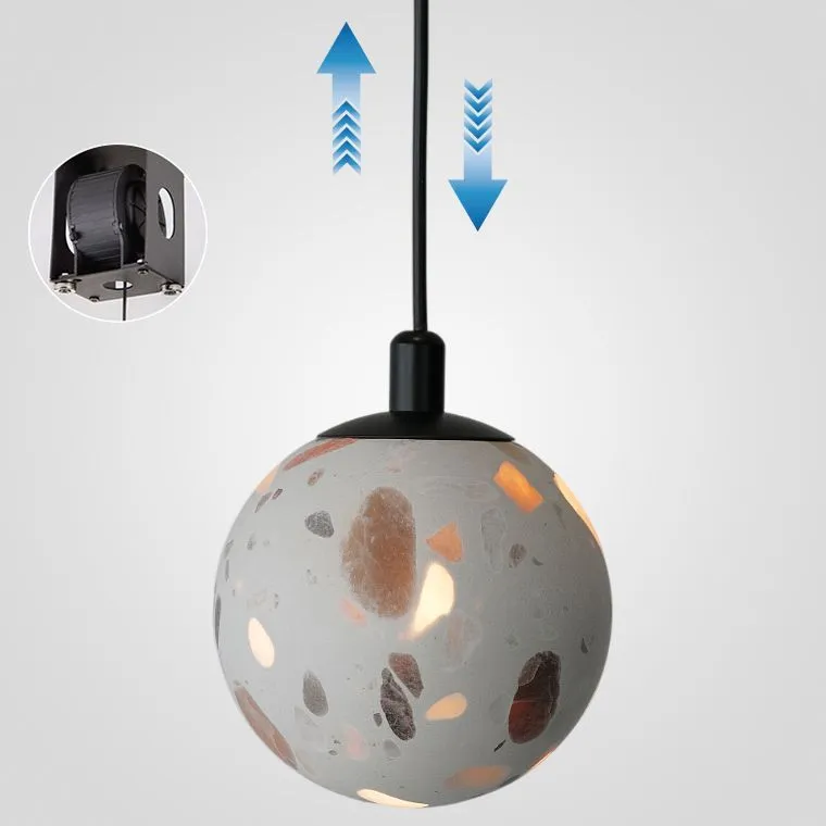 Серия подвесных светильников в форме шара из серого мрамора с разноцветными вкраплениями и регулируемым подъемным механизмом