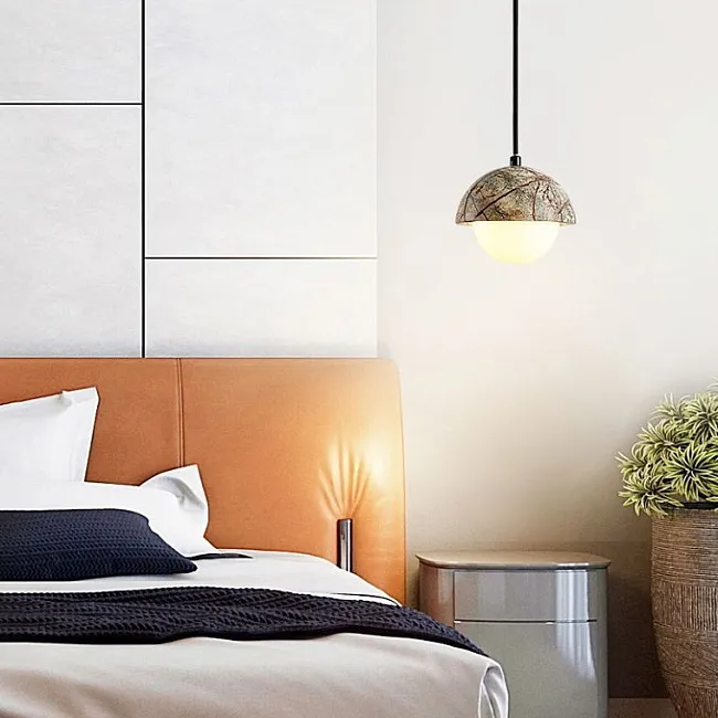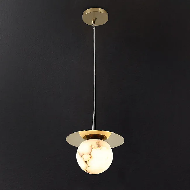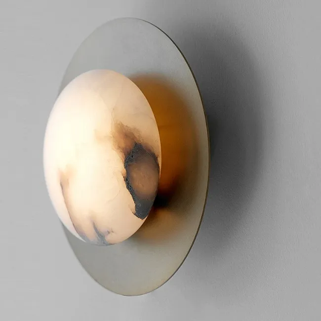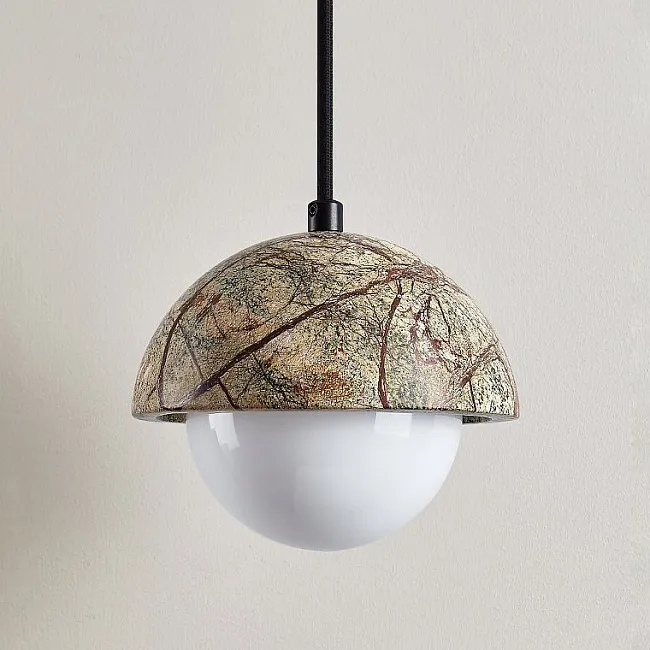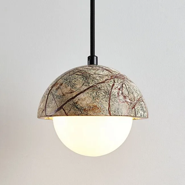 Особенно за счёт мраморных вставок, которые частично просвечивают — он больше как декоративный акцент, чем основной источник света. У нас интерьер с природными материалами — камень, натуральное дерево — и этот эко-вариант подошёл идеально.