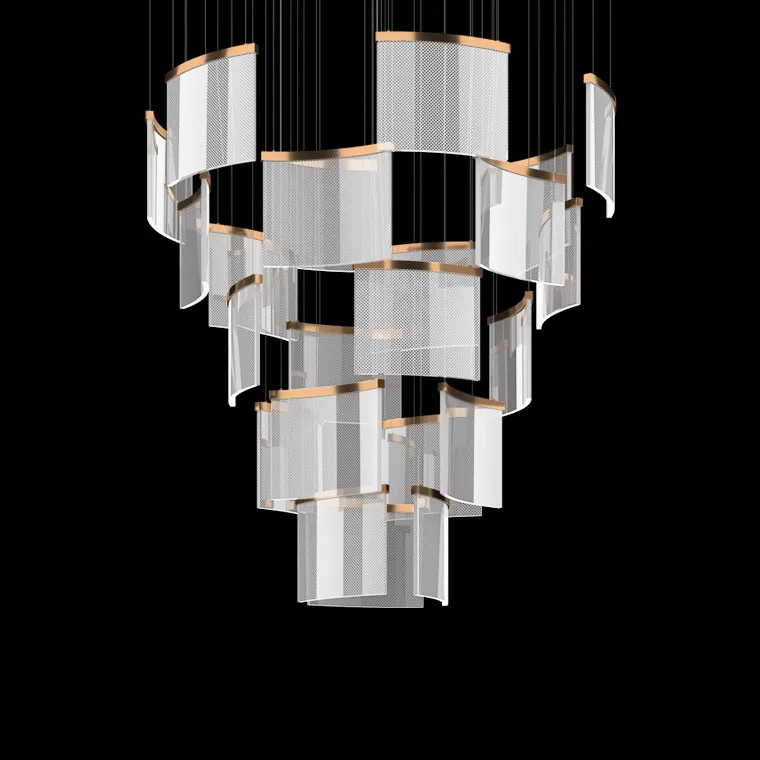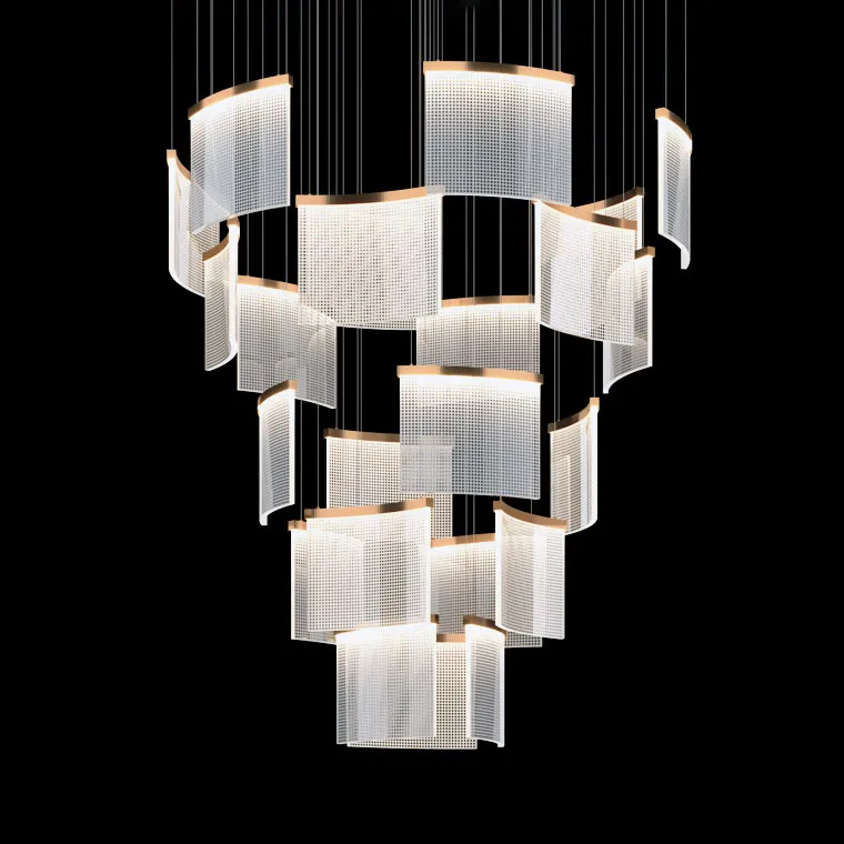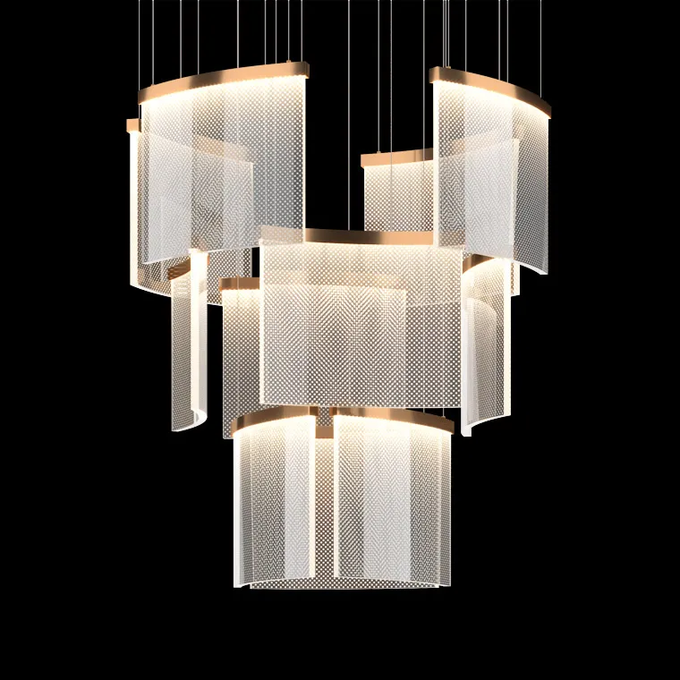 Готовая каскадная комбинация подвесных светильников с прямоугольными плафонами с точечной и сетчатой гравировкой на прозрачной поверхности