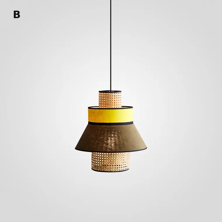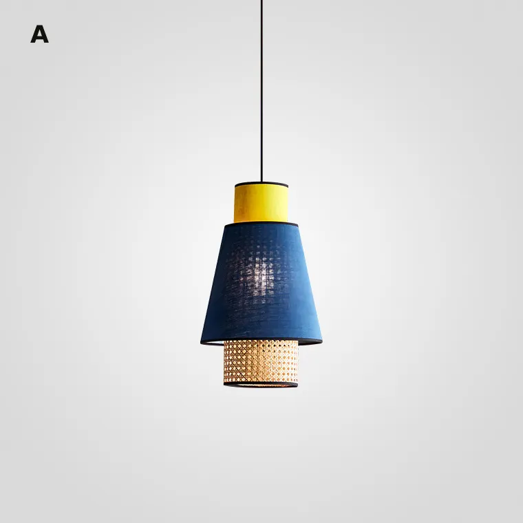 Серия подвесных светильников с рассеивателями из цветного текстиля и плетеного ротанга