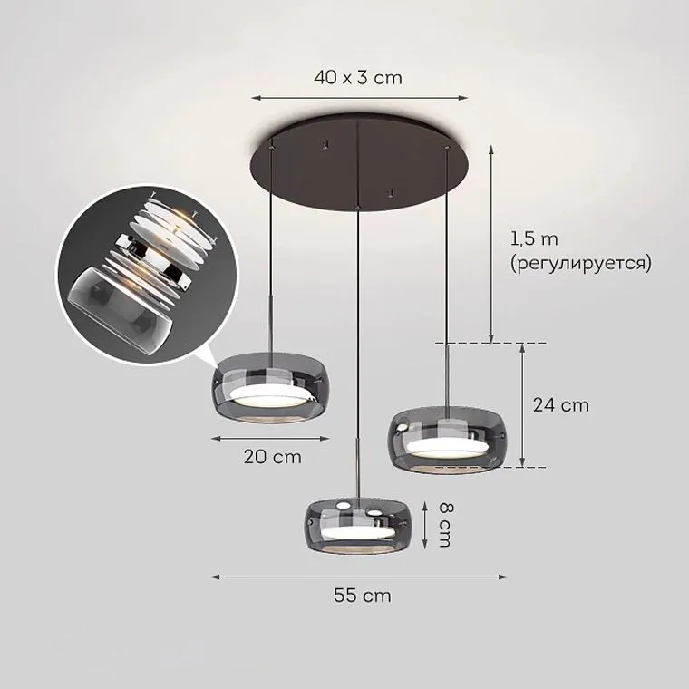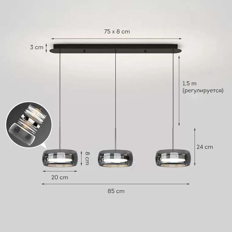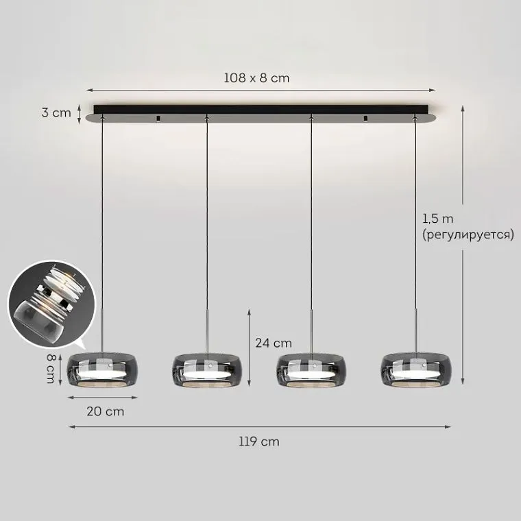 Вы можете выбрать комплектацию точно под ваши нужды: одиночный подвес, двойной, сборка на три или четыре светильника. Одиночный светильник идеально подойдет для прикроватной зоны, создавая уютное настроение для расслабляющего вечера. Сборки из нескольких светильников украсят вашу кухонную зону или барную стойку, наполняя пространство гармоничным и стильным светом.