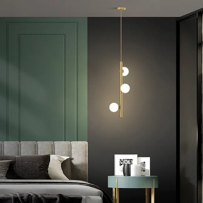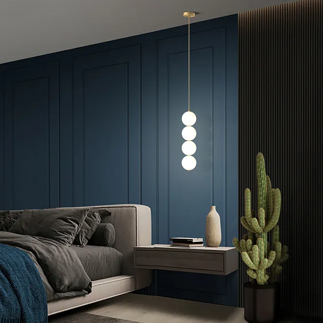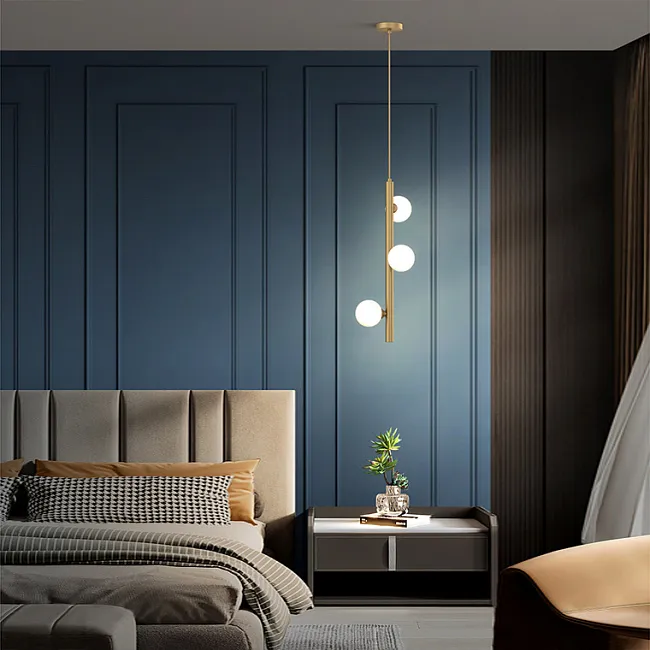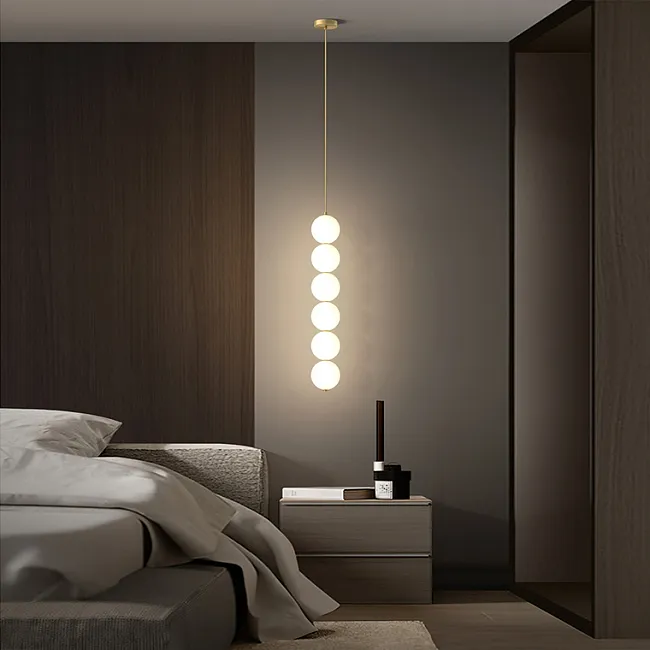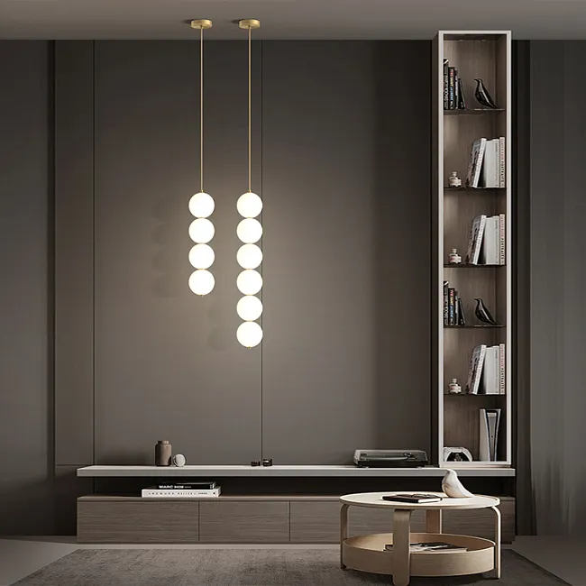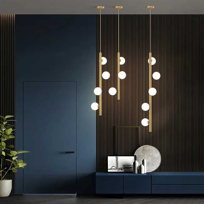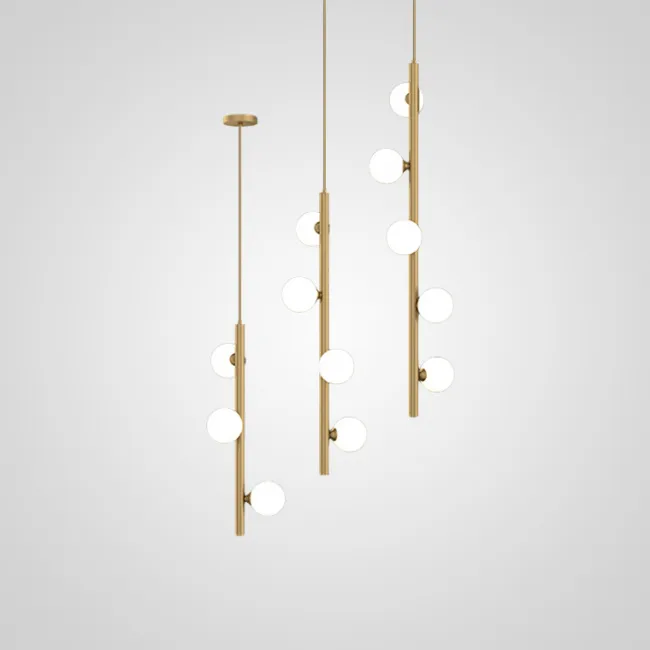 Каскадный светильник на общей потолочной стойке с шарообразными плафонами молочного цвета