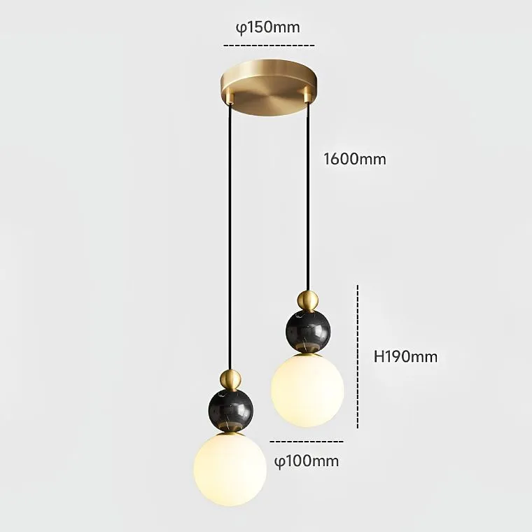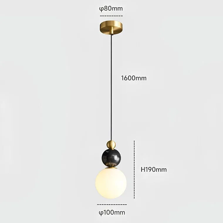 Контраст и выразительность: Белый шар плафона на контрасте, увенчанный черным мраморным шаром, символизирующим силу и глубину. Над ним, словно яркая звезда, сияет маленький латунный шар, добавляя игривости и драматизма.