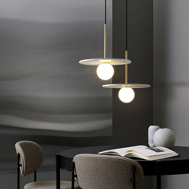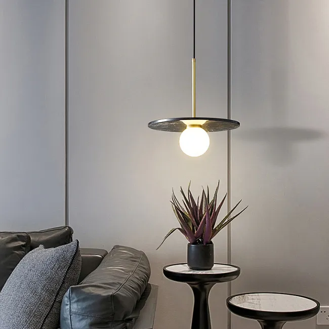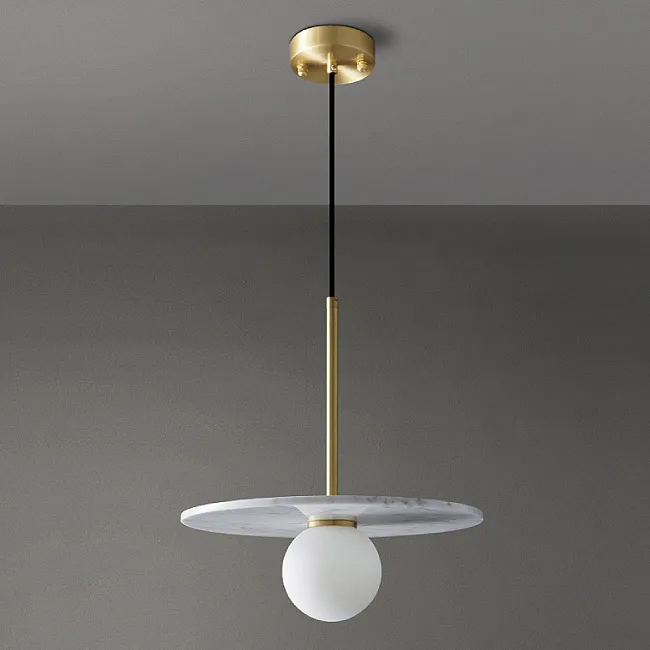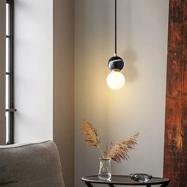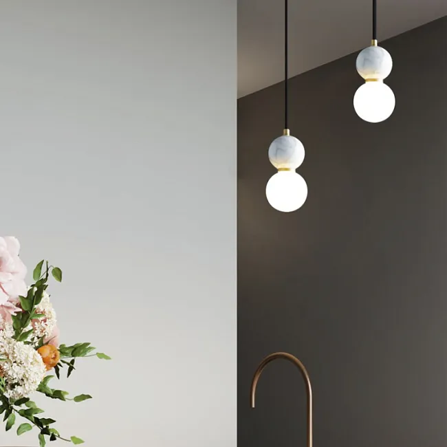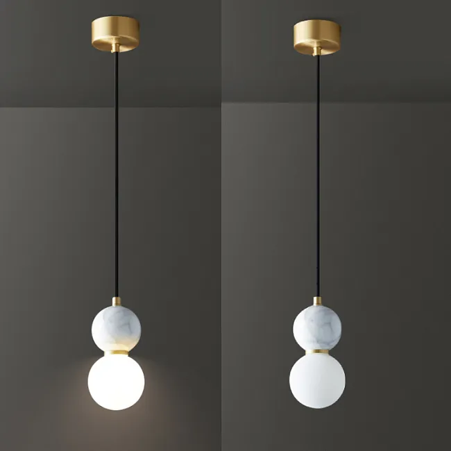 Контраст и выразительность: Белый шар плафона на контрасте, увенчанный черным мраморным шаром, символизирующим силу и глубину. Над ним, словно яркая звезда, сияет маленький латунный шар, добавляя игривости и драматизма.