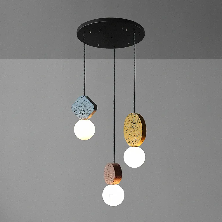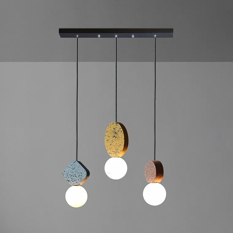 Готовая комбинация подвесных светильников с тремя шарообразными плафонами в мраморных держателях геометрической формы