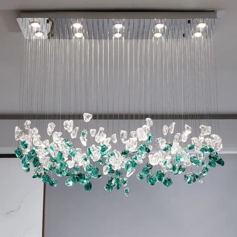 Погрузитесь в атмосферу волшебства и природной гармонии с нашим эксклюзивным рядом светодиодных инсталляций, которые не просто украшают ваше пространство, но и вдохновляют на создание собственной истории. Эти изящные подвесные элементы из прозрачного и зеленого стекла словно созданы самой природой — их неправильная, округлая форма напоминает о каплях дождя, застывших в воздухе, ожидая момента, чтобы заискриться под направленными лучами спотов.