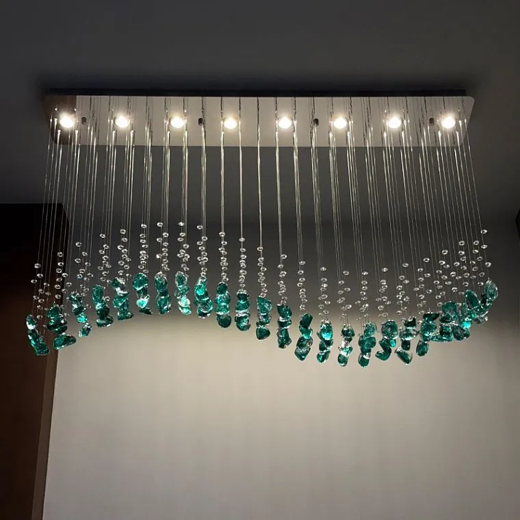 Погрузитесь в атмосферу волшебства и природной гармонии с нашим эксклюзивным рядом светодиодных инсталляций, которые не просто украшают ваше пространство, но и вдохновляют на создание собственной истории. Эти изящные подвесные элементы из прозрачного и зеленого стекла словно созданы самой природой — их неправильная, округлая форма напоминает о каплях дождя, застывших в воздухе, ожидая момента, чтобы заискриться под направленными лучами спотов.