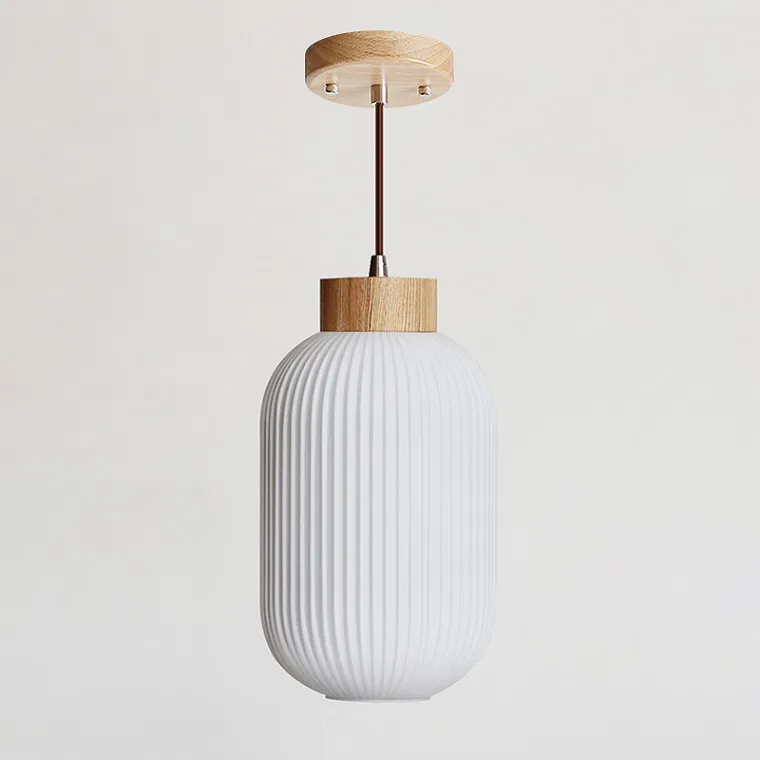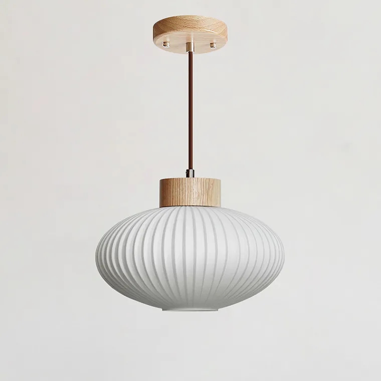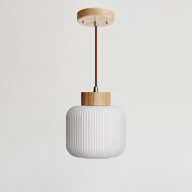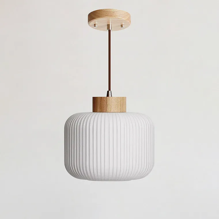 Серия подвесных светильников с геометрическими плафонами из рельефного стекла c деревянными элементами