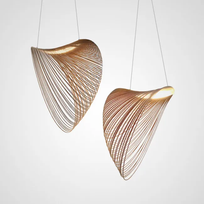 Серия подвесных светильников с деревянным ассиметричным каркасом и конусообразным абажуром