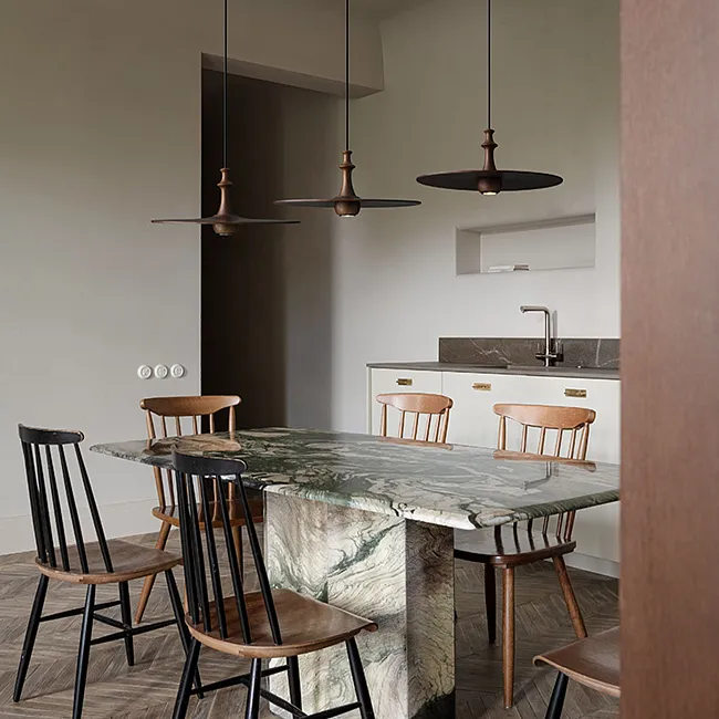 Идеальное сочетание природы и современного дизайна в вашем доме. Подвесной светодиодный светильник, созданный в гармонии с эко-стилем, станет настоящей жемчужиной на вашей кухне. Он словно весенний ветерок приносит дух природы в ваш интерьер. Три изящных плафона, напоминающие лопасти, выполнены из натурального дерева и предлагают вам на выбор два неповторимых оттенка: нежное светлое дерево или глубокое темное, каждый из которых имеет свою уникальную текстуру и шарм.