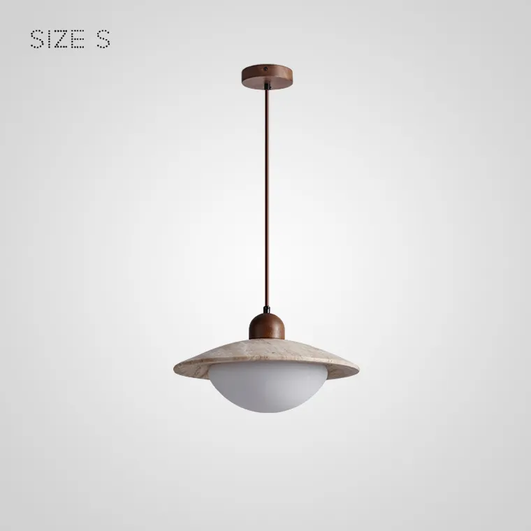 Серия подвесных светильников с шаровидным плафоном и купольным абажуром из камня тревертина и дерева