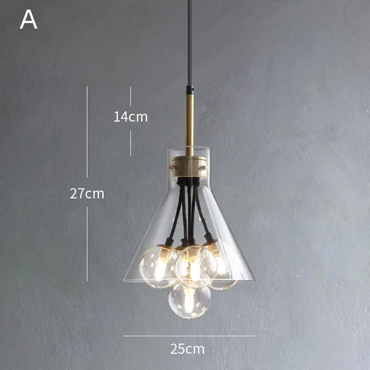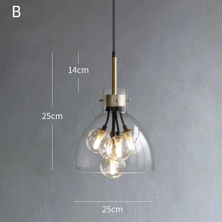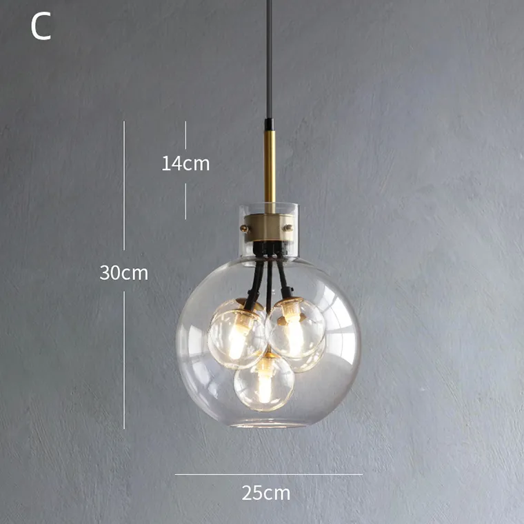 Серия подвесных светильников с прозрачными шарообразными плафонами в разновидных стеклянных абажурах