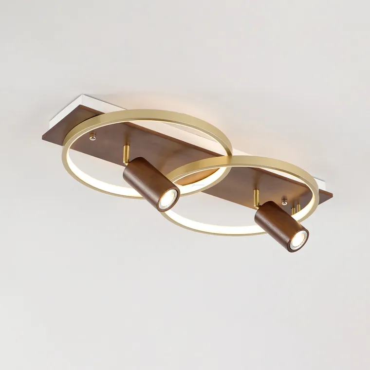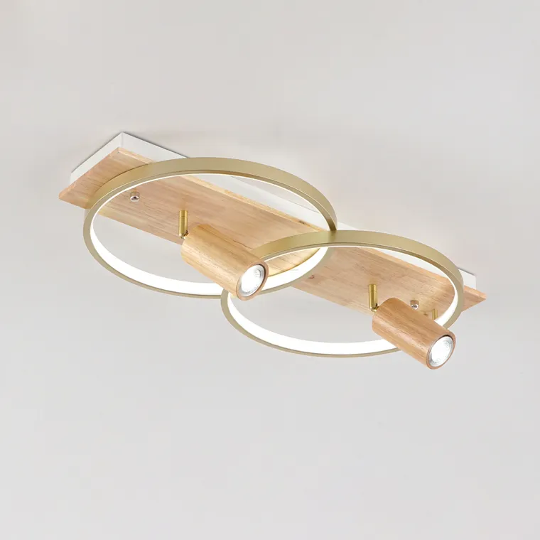 Серия потолочных светильников в виде комбинации деревянных цилиндрических плафонов и светодиодных колец на прямоугольном основании