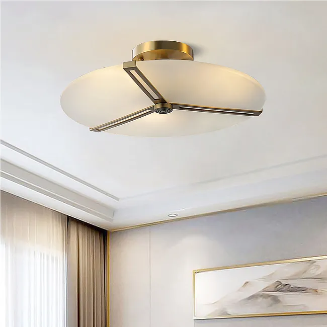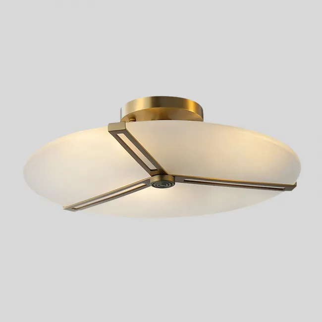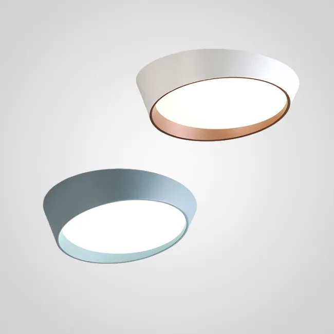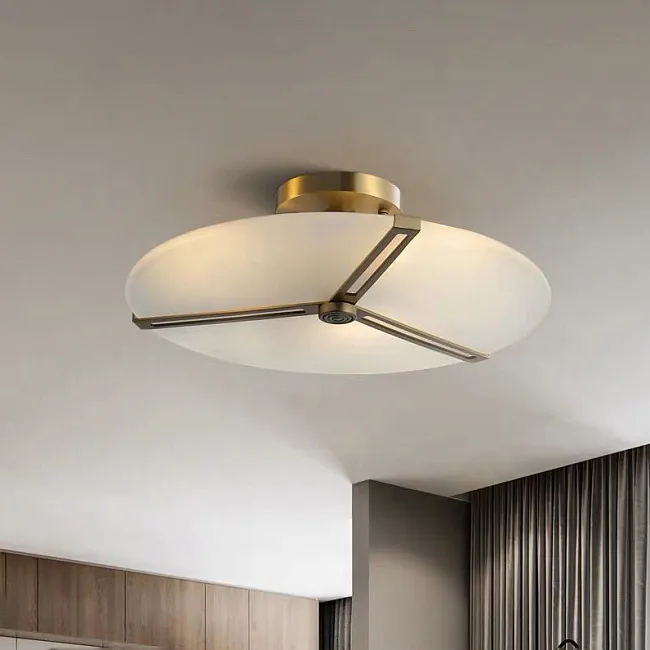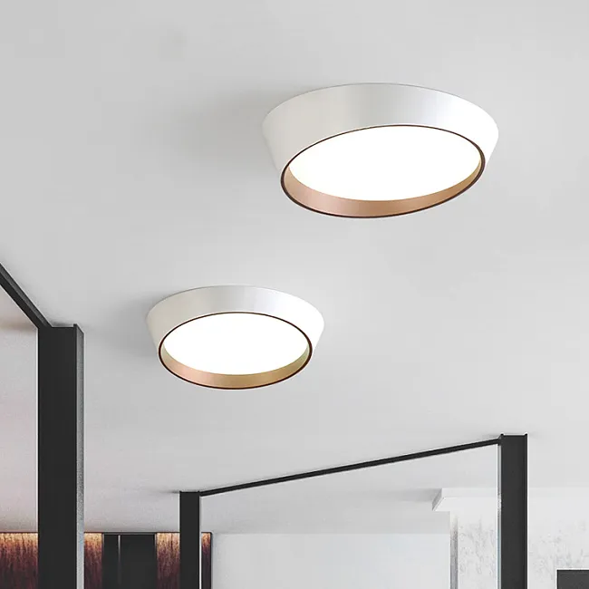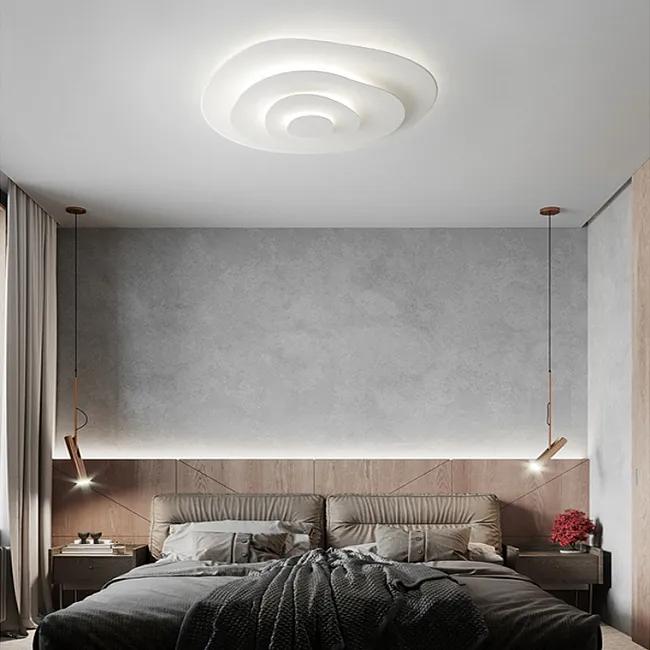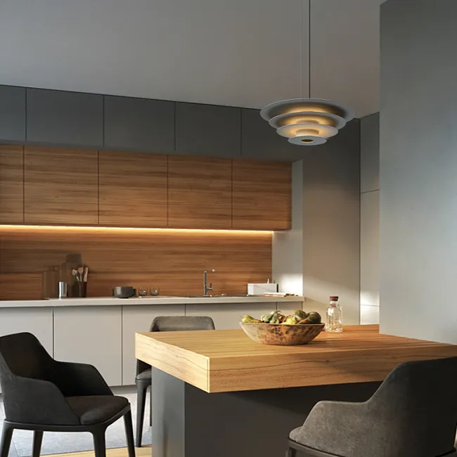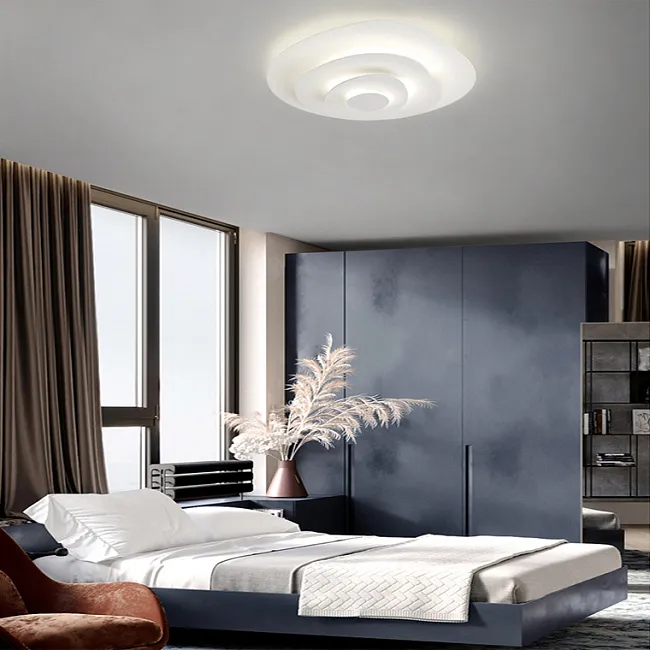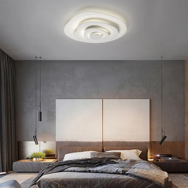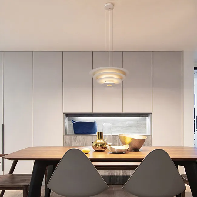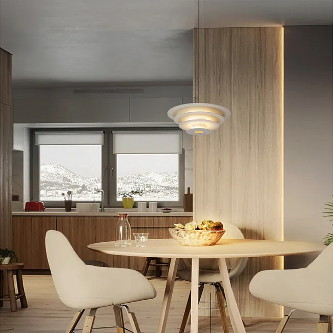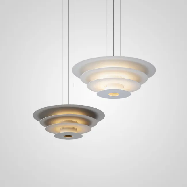 Потолочный светодиодный светильник с многослойным абажуром из белых дисковидных пластин разного диаметра и декоративным элементом черного цвета