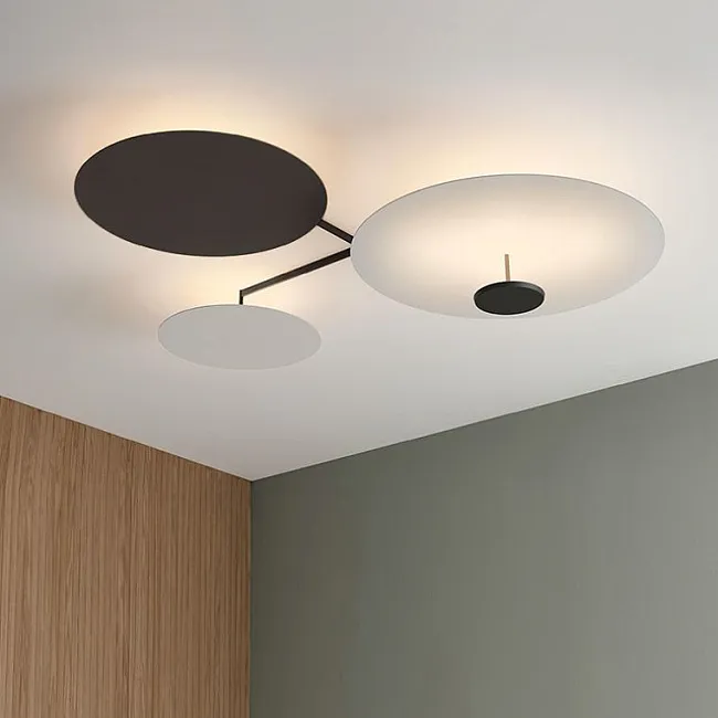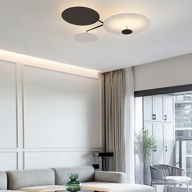 Есть и дизайнерские светильники потолочные в стиле лофт. Они имеют более нестандартное, интересное исполнение, например, в виде дуг, колец, колб, стержней, пластин, светящихся панелей, абстрактных фигур, реек, многогранников, камней, классических или скошенных цилиндров, а также целых инсталляций из геометрических или других элементов.