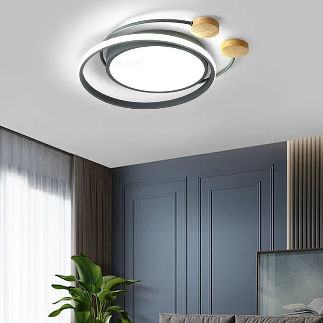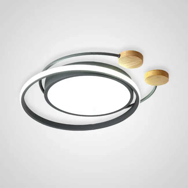 Серия потолочных светодиодных светильников со светящимися кольцами и декором из светлого дерева