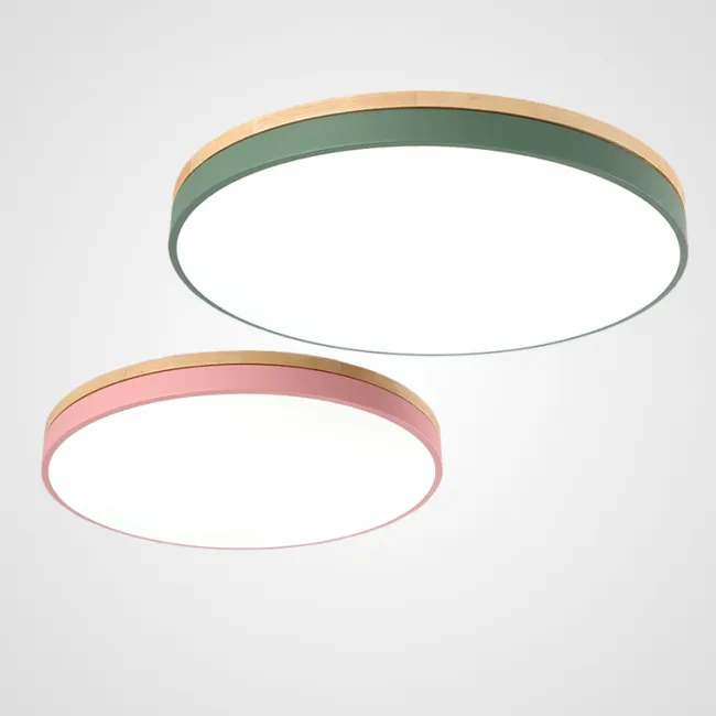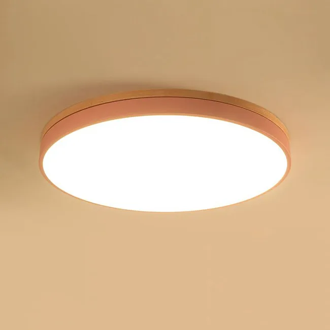 Серия потолочных светодиодных светильников с каменным корпусом на круглом основании из темного и светлого дерева