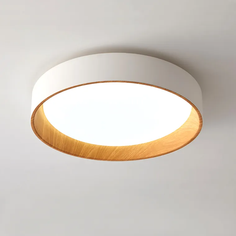 Светильник имеет круглую LED-панель, которая обеспечивает равномерное и яркое освещение. Белый матовый корпус с внутренней отделкой под светлое дерево выглядит элегантно и современно.