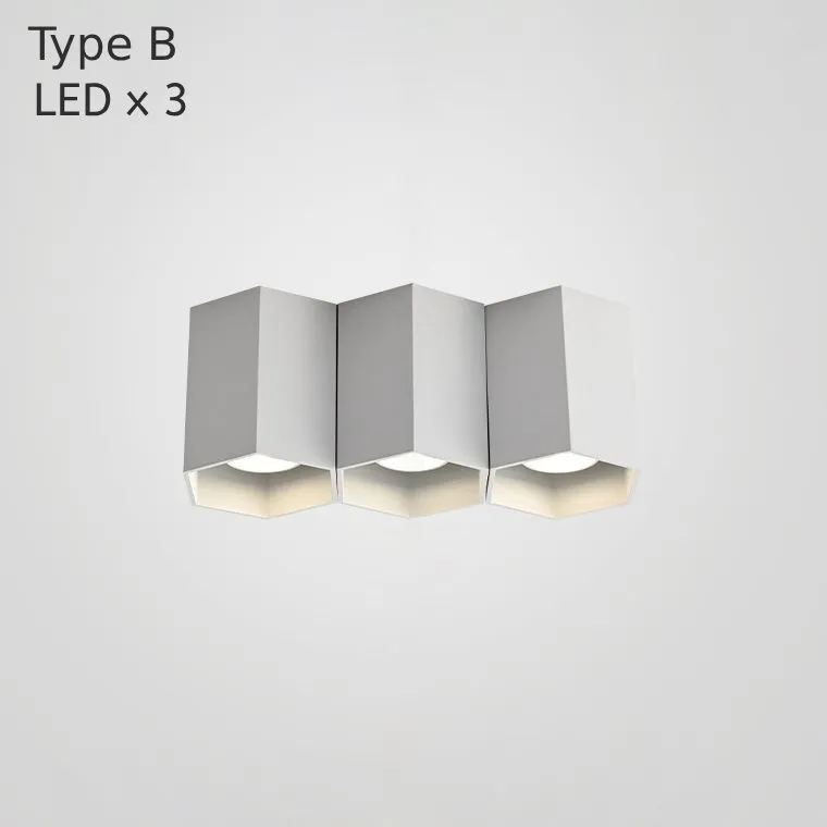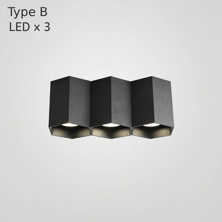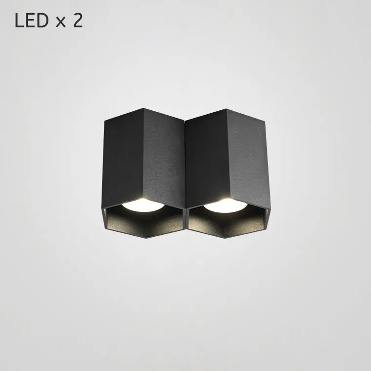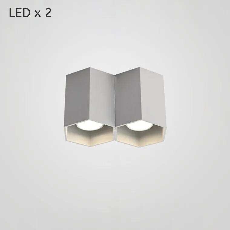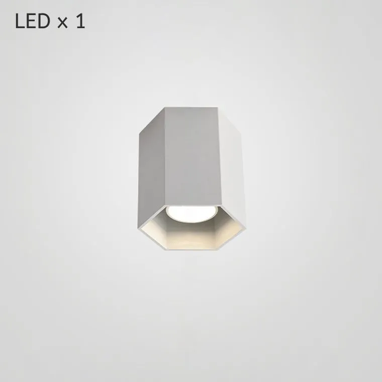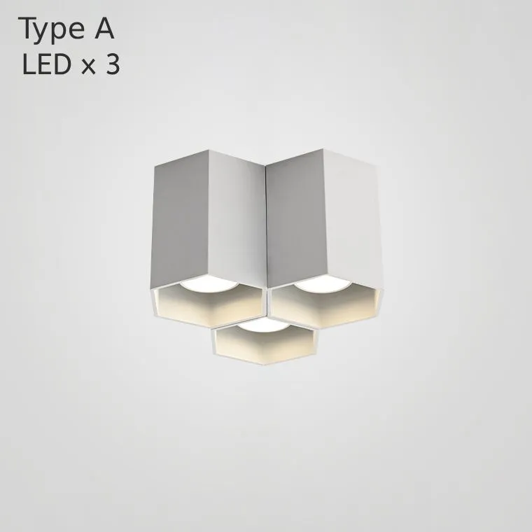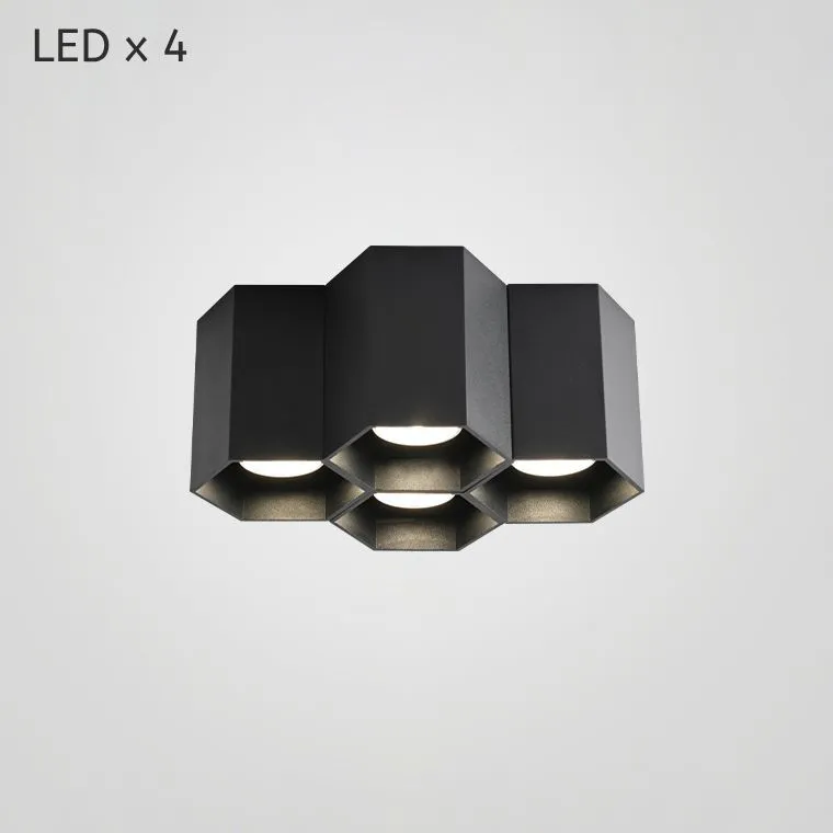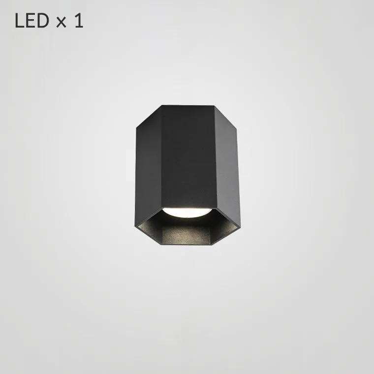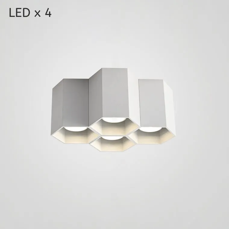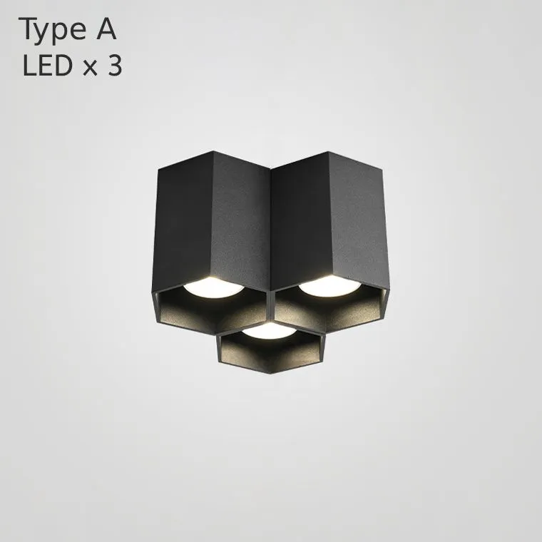Серия точечных светодиодных светильников с металлическими плафонами в форме шестигранников.