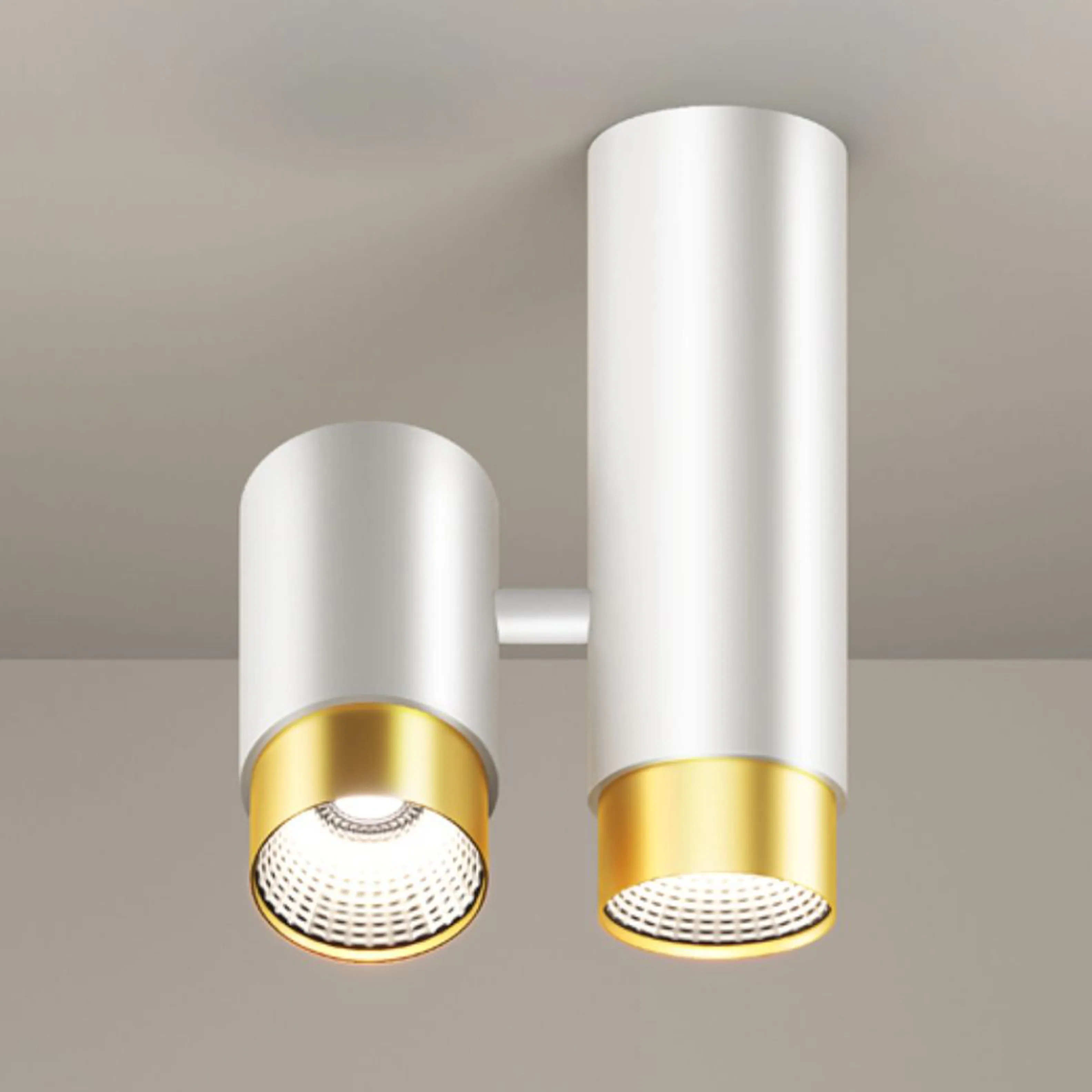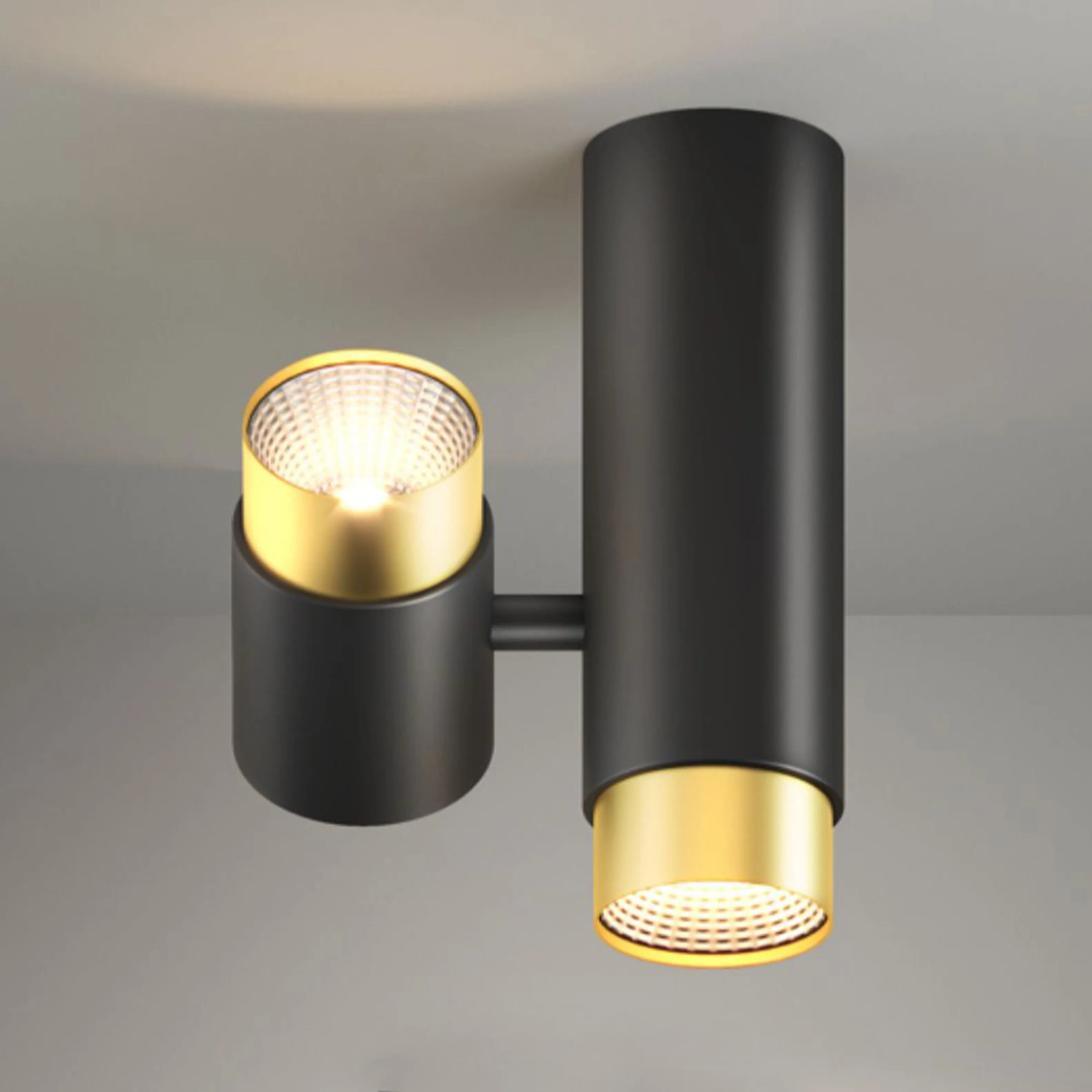 Этот светильник обладает уникальным дизайном, который сочетает в себе фиксированный и поворотный плафоны цилиндрической формы. Основной плафон имеет размер Ø 6 × 17 см и обеспечивает яркое и равномерное освещение, а поворотный плафон размером Ø 6 × 9 см позволяет регулировать направление света, создавая комфортное освещение в любой зоне помещения. Варианты цветов - черный + золото, белый + золото и золото.