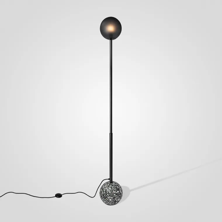 Дизайнерский торшер с черным матовым плафоном и шарообразным основанием из мрамора терраццо
