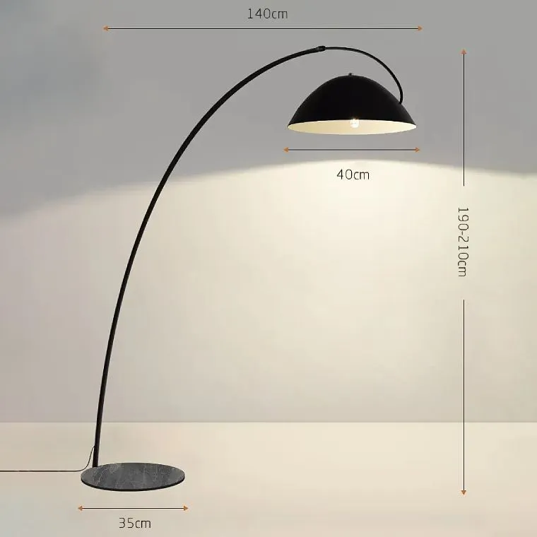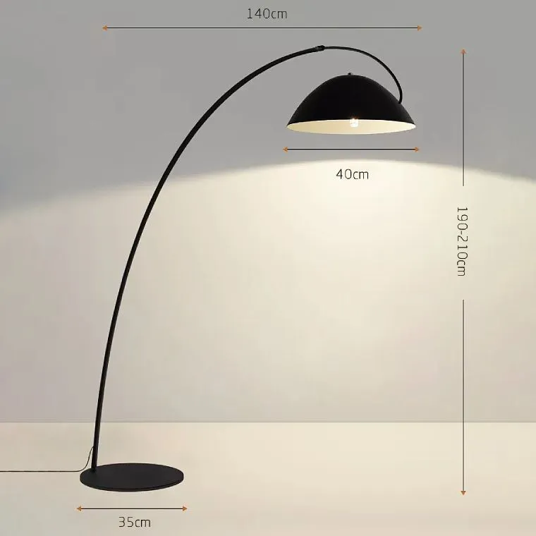 Современный напольный светильник с изогнутой дугообразной стойкой и купольным абажуром в минималистичном стиле