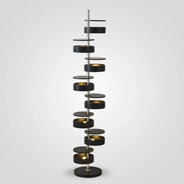 Хромированная стойка, словно вертикальный мост между небом и землей, уверенно поддерживает эти прекрасные элементы дизайна. Разнонаправленные диски создают интересную игру света и тени, добавляя глубину и динамику вашей комнате. Вы можете выбрать вариант с плафонами цвета черного дерева, добавляющего изысканности и драматизма, или предпочесть теплый оттенок ореха, создающий атмосферу близости и душевного тепла.