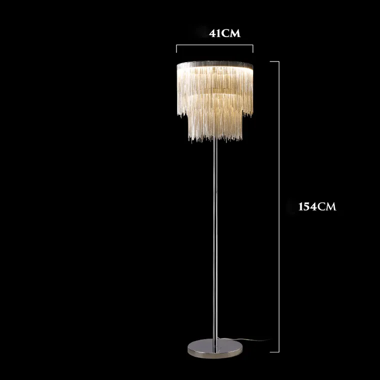 Дизайнерский торшер с цилиндрическим абажуром из множества хромированных цепочек разной длины