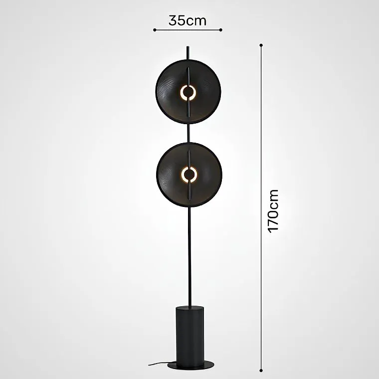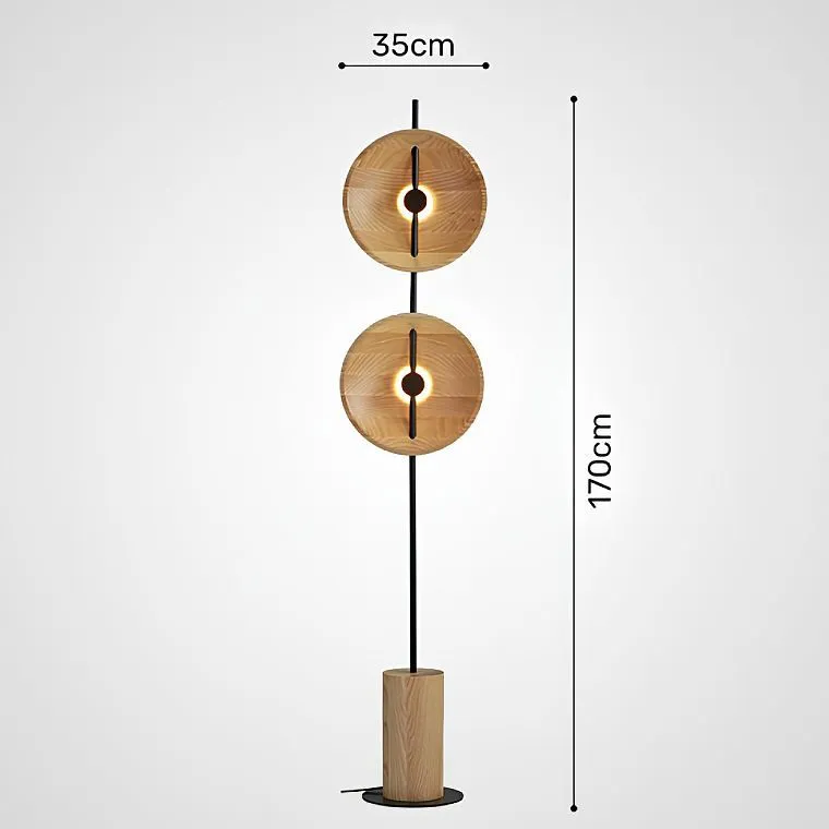 Серия дизайнерских торшеров с двумя плафонами в виде вогнутых дисков из дерева с LED подсветкой