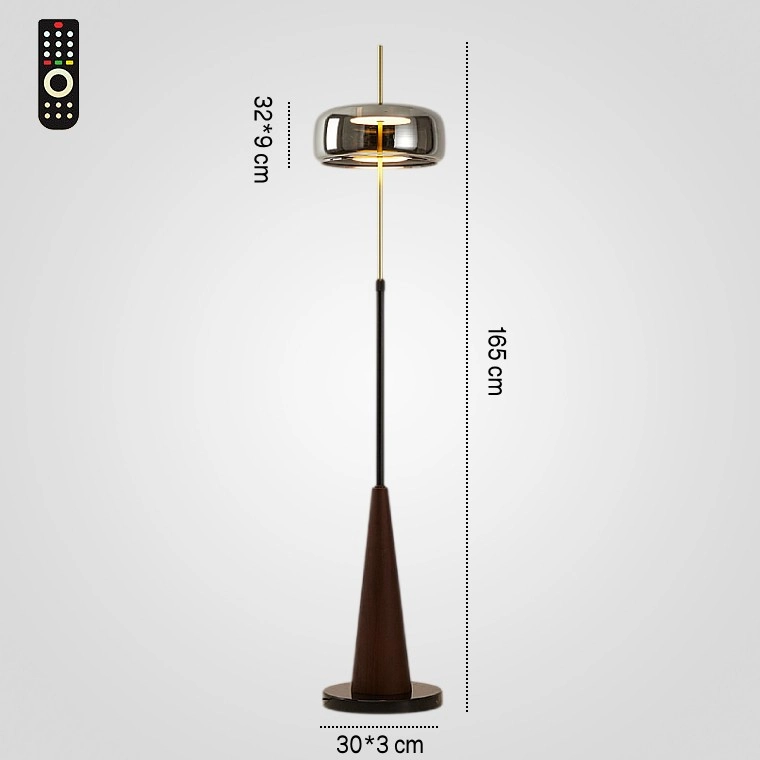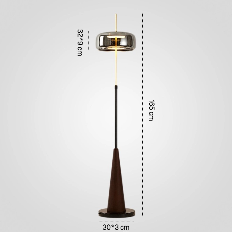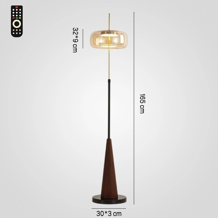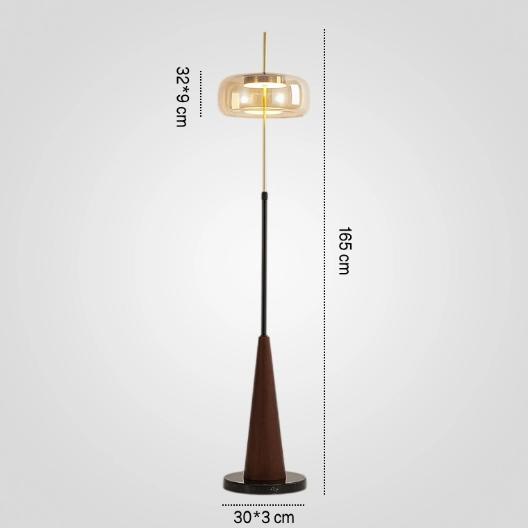 Серия современных напольных светильников с округлым рассеивателем из тонированного стекла на коническом основании из комбинации мрамора и дерева