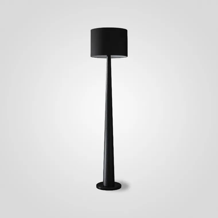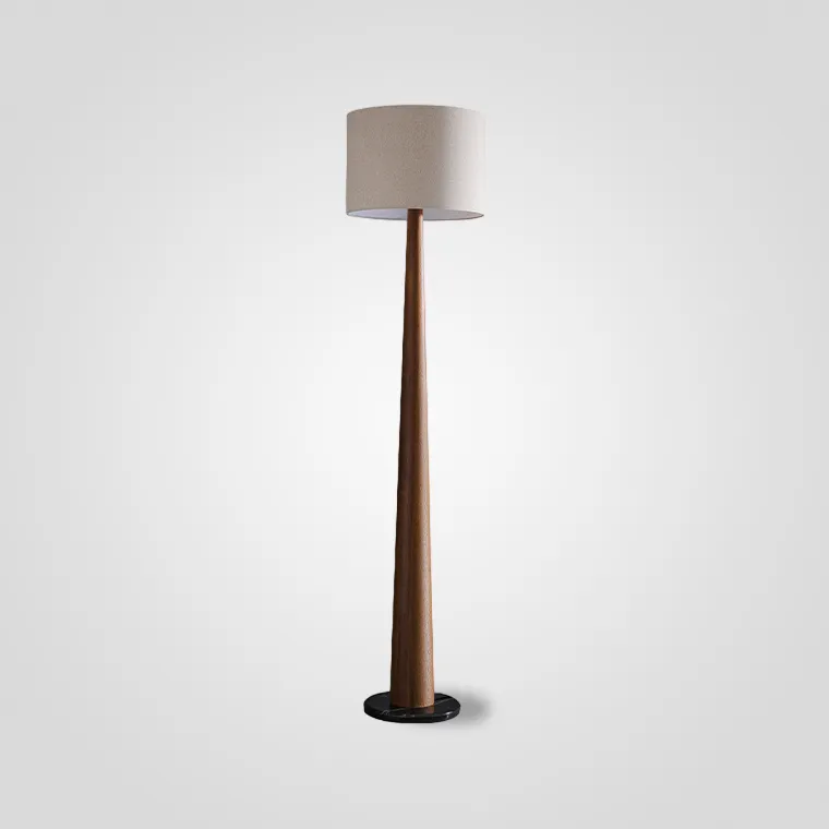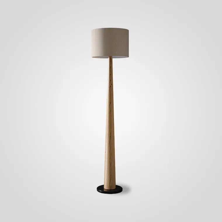 Напольный светильник с цилиндрическим абажуром и стойкой конической формы из массива дерева