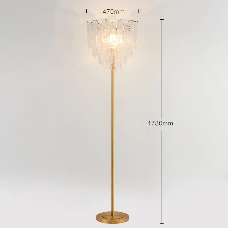 Стильный дизайн торшера сочетает в себе прозрачные стеклянные пластины и латунный каркас, что придает ему современный и элегантный вид, который будет гармонично смотреться в любом интерьере.