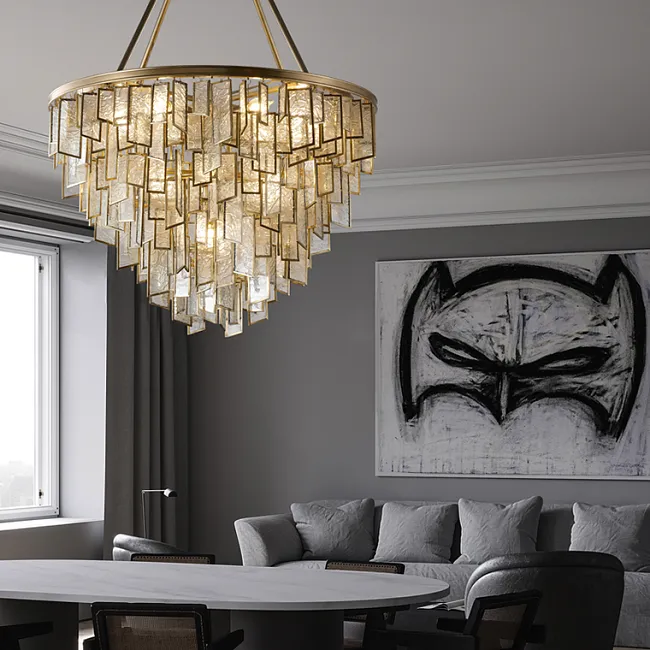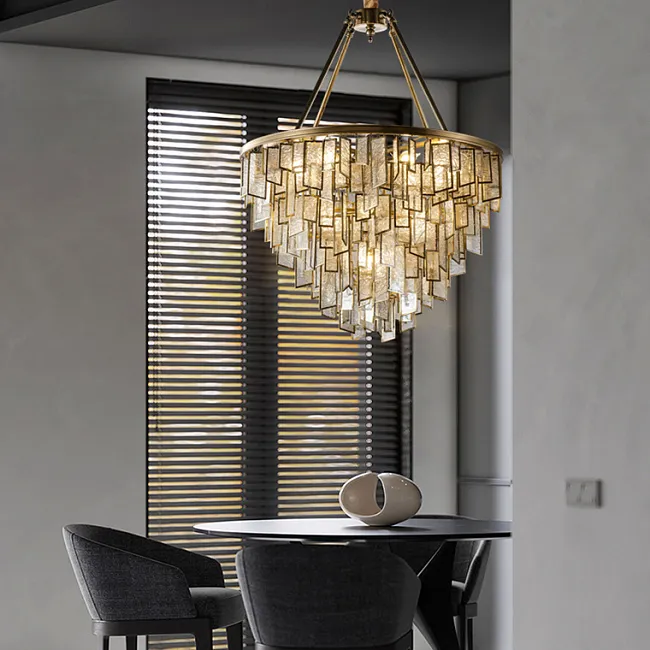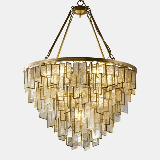 Стильный дизайн торшера сочетает в себе прозрачные стеклянные пластины и латунный каркас, что придает ему современный и элегантный вид, который будет гармонично смотреться в любом интерьере.