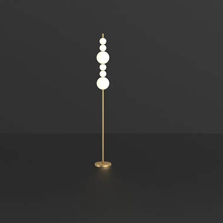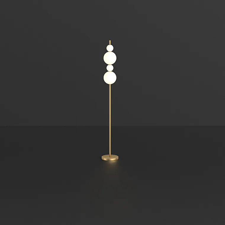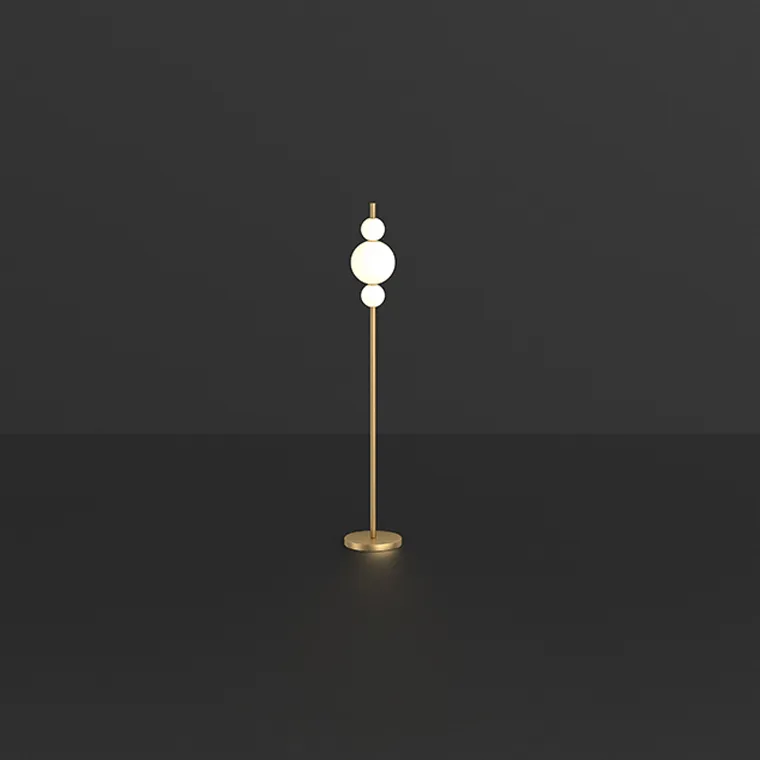 Серия напольных светильников с белыми шарообразными плафонами на вертикальной стойке из настоящей латуни